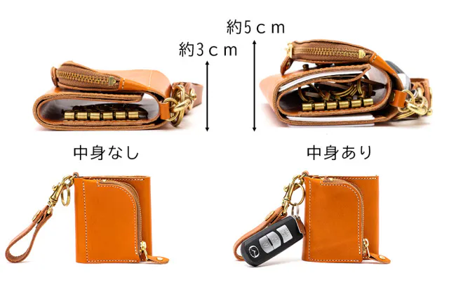 一般的な折財布とキーケースの中身を全てまとめる事が出来ます。