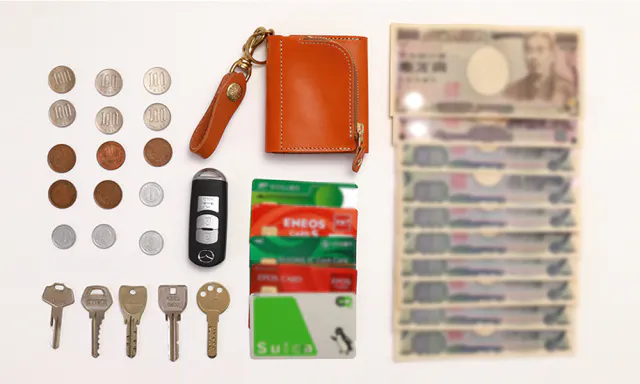 【お札:10枚 カード:5枚 小銭:15枚 鍵:5本 スマートキー:1本】程度が収納可能。