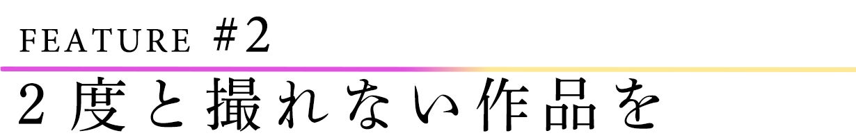 また、撮影するときの光の量・色・位置などによって効果の出方が変化するため、同じものは二度と撮れない“一期一会の作品”を撮ることができます。