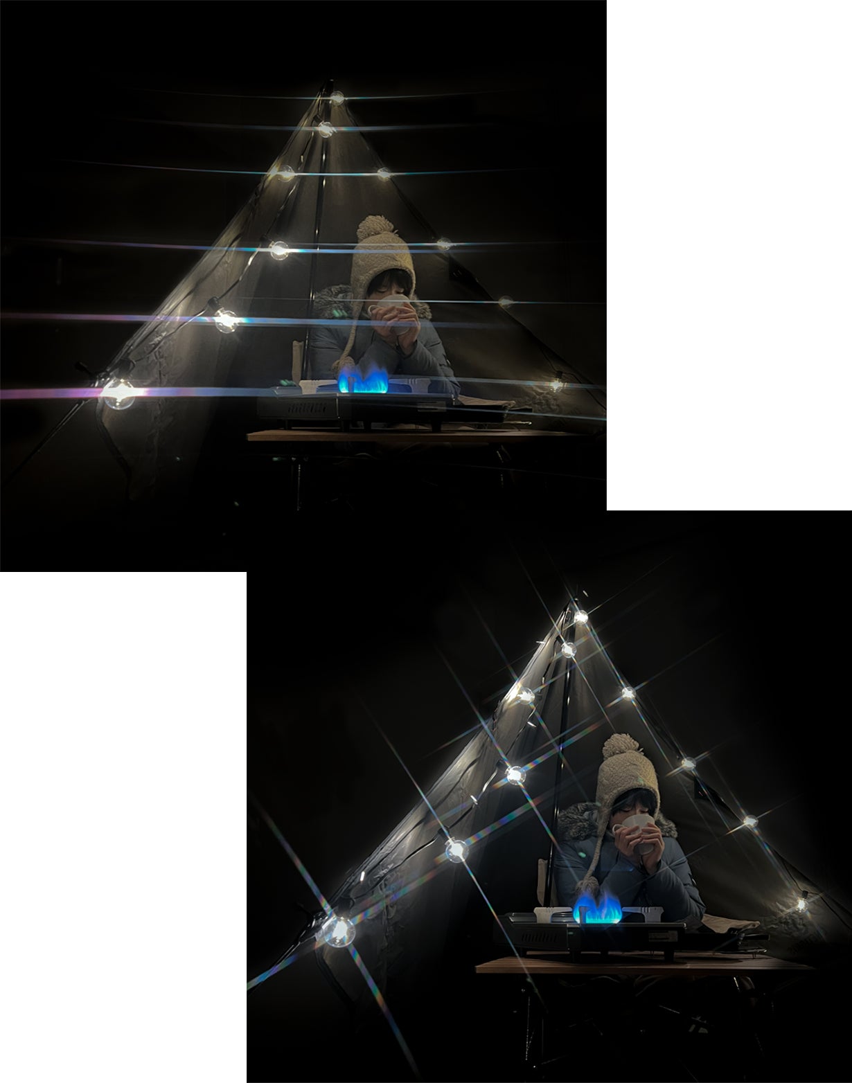 例えば、アウトドアでの撮影。自然の夜の暗さと、ランタンなどの灯りを組み合わせると、見るひとの目を奪うような表現ができるように。