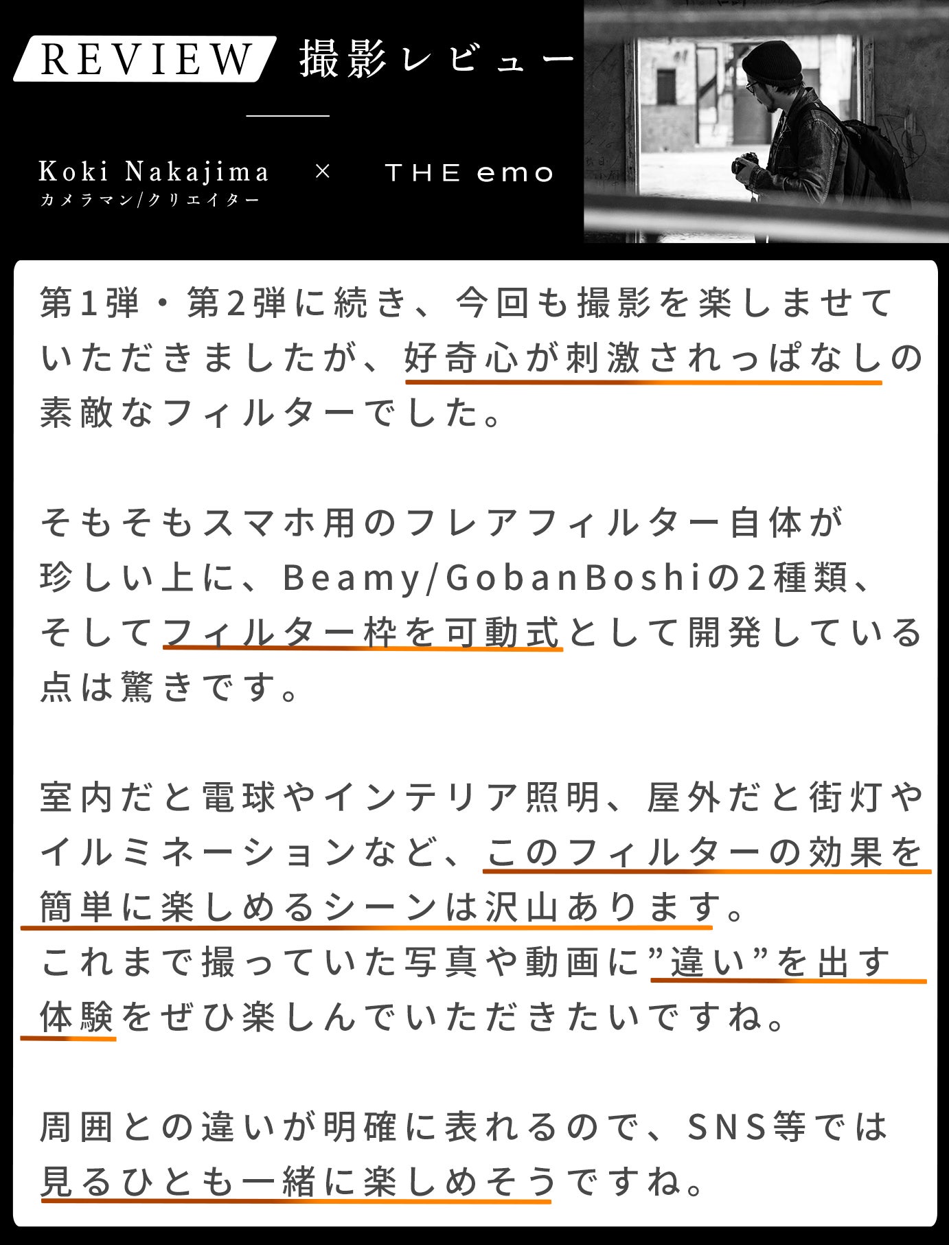 「THE emo」は、プロのカメラマンらが一眼カメラで使用する特殊フィルターをスマホカメラ用に開発するために始まったシリーズで、第1弾のバリアブルNDフィルター、第2弾のブラックミストフィルターに続く、第3/4弾の商品となります。