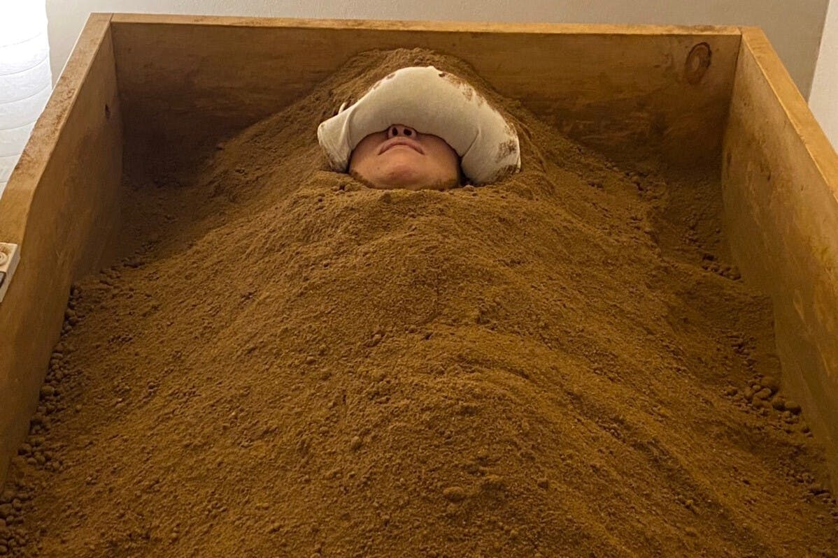 仰向けで15分、うつ伏せで15分入るだけで体の芯から温まる薬草酵素温浴。サラサラの汗がもたらす爽快感を、次はあなた自身でぜひ試してみてください!