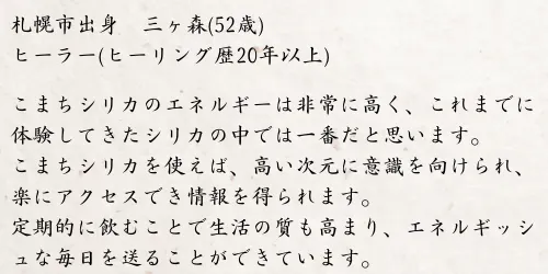 この量子波は高周波のため、肌感覚で感じることは難しいですが、こまちシリカをご飲用いただいたヒーラーさんからは実感のお手紙をいただいています。