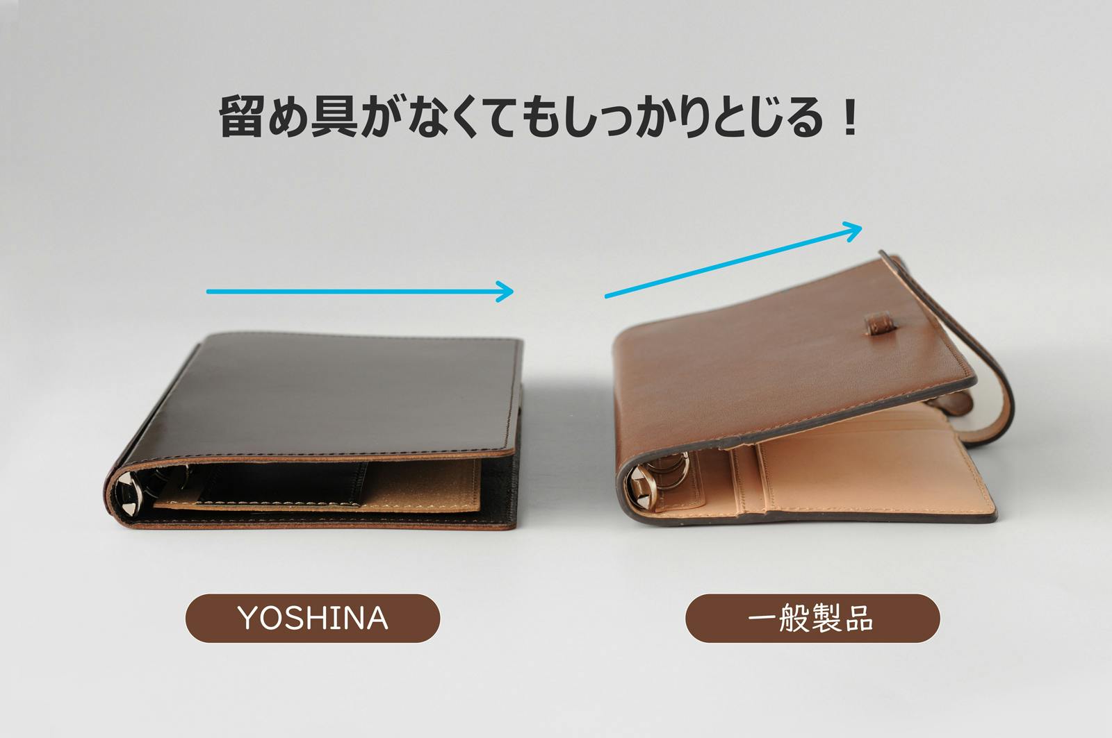 システム手帳は、携帯性が重要課題です。YOSHINAはデザイン性を損なわず、同じリング径の市販システム手帳と比べると、薄さと軽さを実現できました。