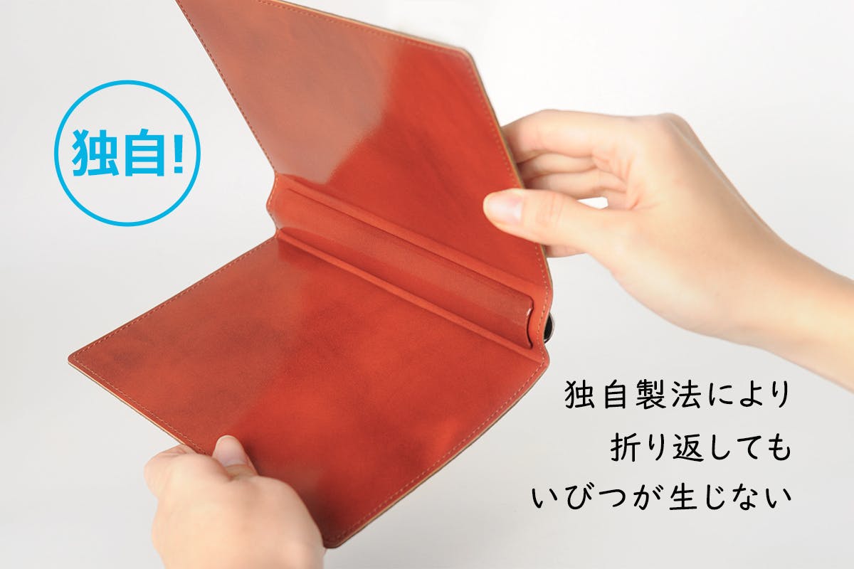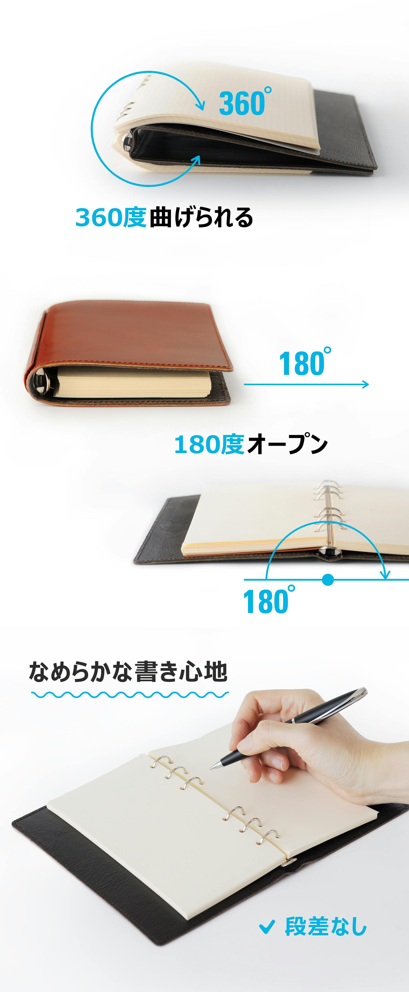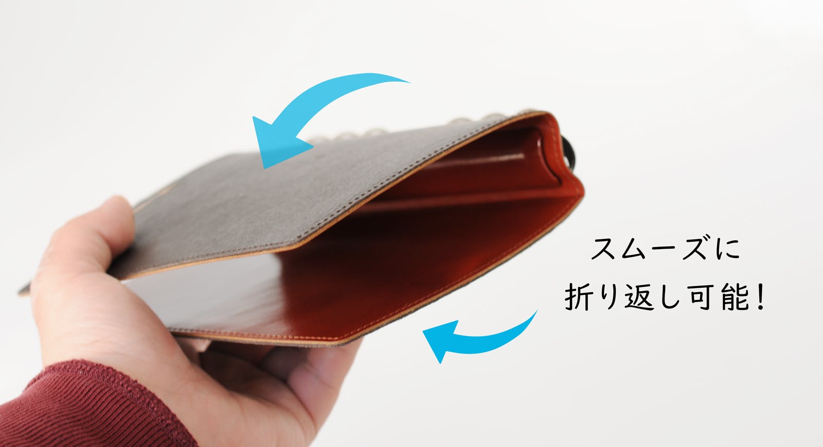 バックプレートとリングで貼り合わせた一枚革を挟む構造により、完全に開いた状態で使用できます。また、デスクがない環境では折り返した状態で使用可能です。