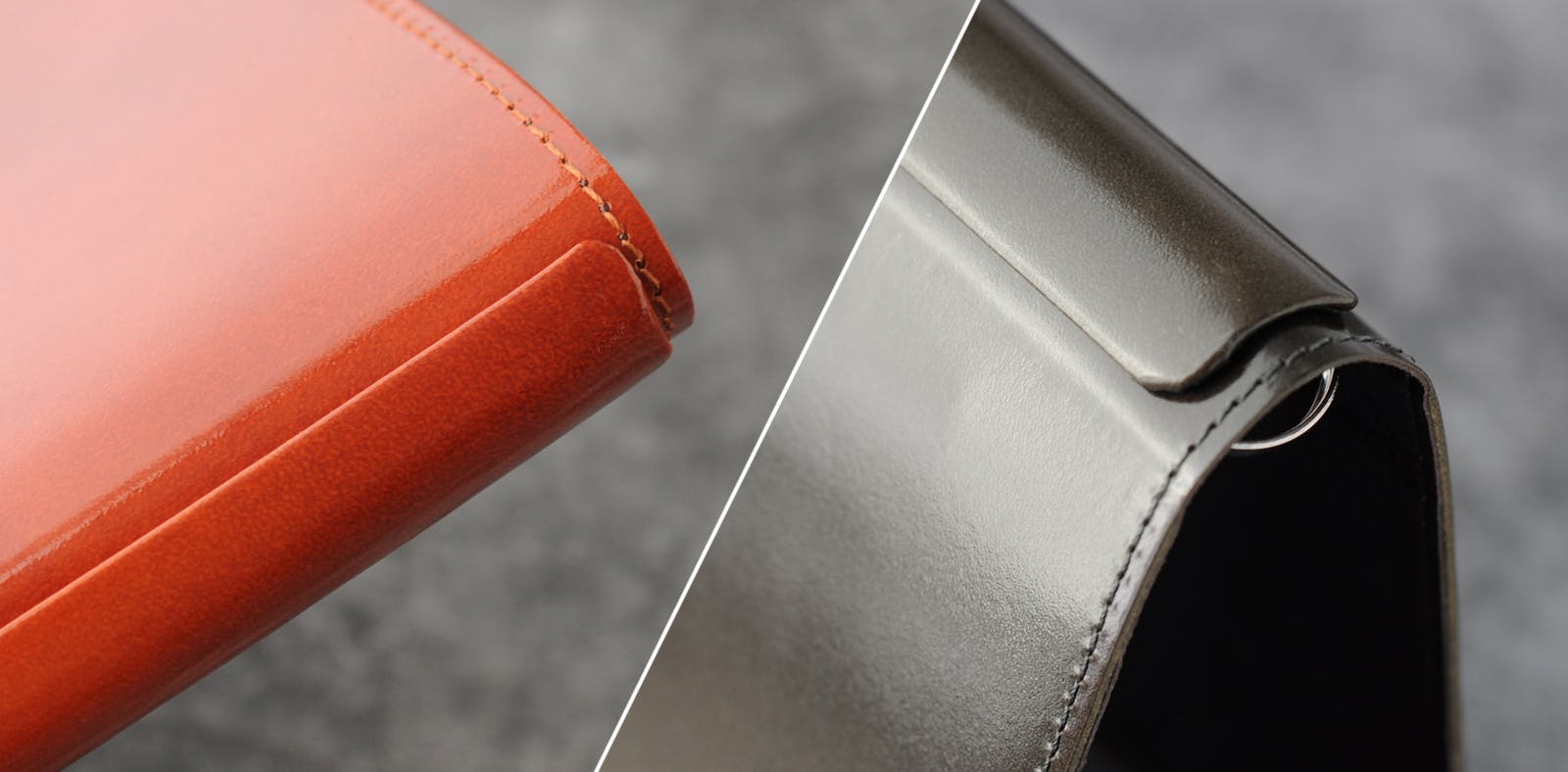 異なる特性の革を使用することにより、硬すぎず、軟らか過ぎず、ちょうど良い「しなやかさ」を実現できます。また、それぞれの革が引っ張りあうことで、製品の耐用性も革一枚のみと比べ変形しにくくなっています。