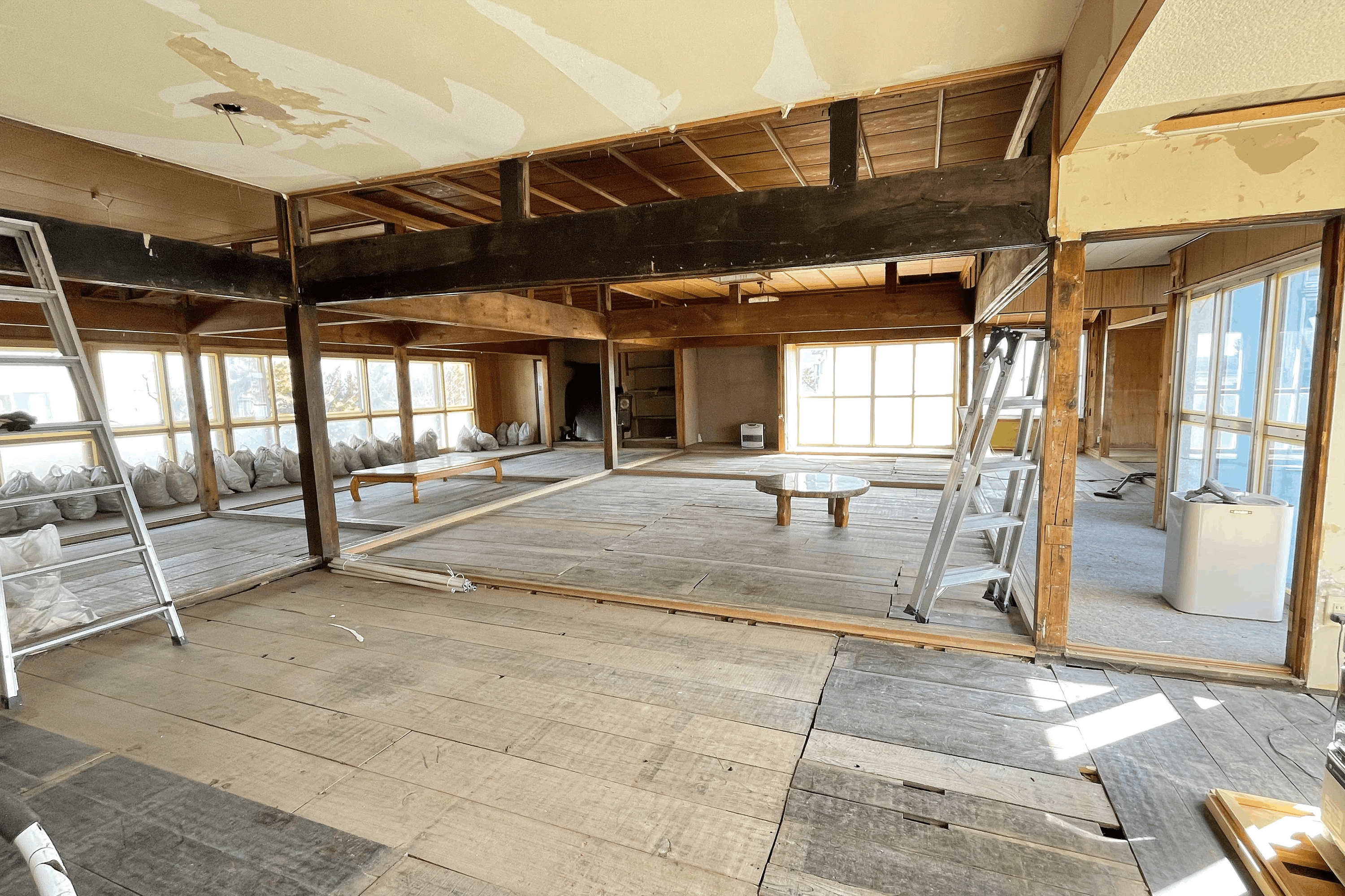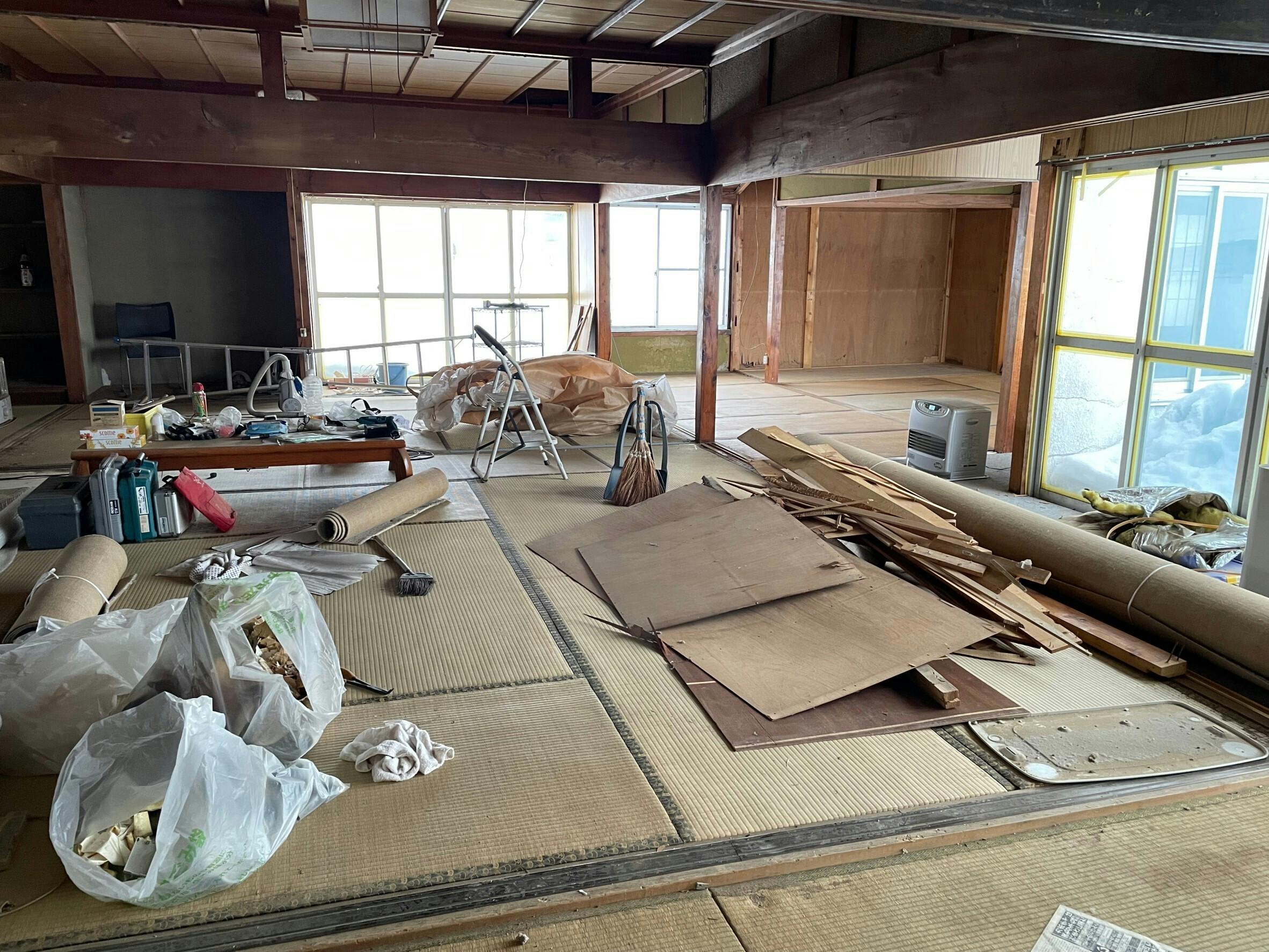古民家の片付けから始まり、畳の廃棄、土壁の一部解体など、出来ることはまわりの協力を得ながら自分たちの手で地道に進め、職人さんにバトンタッチしました。