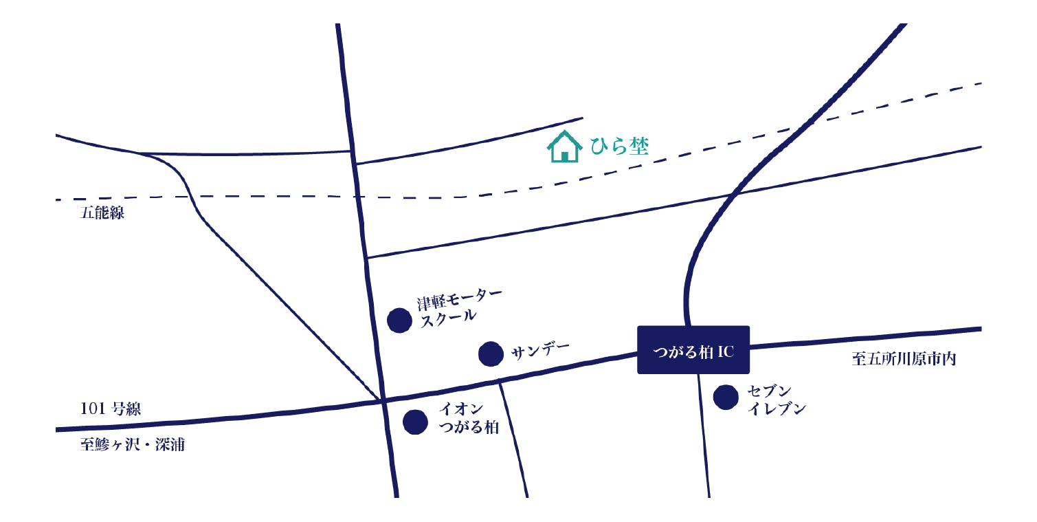 津軽道をつがる柏インターチェンジで下りて、車でおよそ5分の場所にあります。