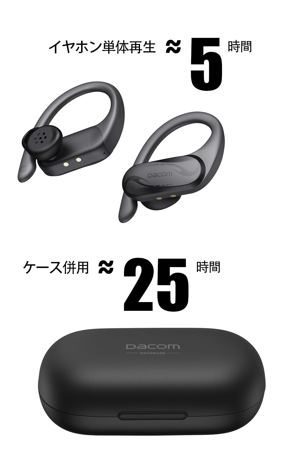 BoneBuds X1は最新のBluetooth 5.3チップを採用しました。消費電力を低減しながら通信範囲や伝送速度を大幅にアップさせ、高い接続安定性を実現します。iPhone、Android等多機種対応、通話やテレワークなどにも快適にお使いいただけます。イヤホンは満充電で、単体最大5時間の音楽再生が可能。充電ケースは本体を4回充電でき、ケースを併用することで最大25時間の音楽再生が可能です。