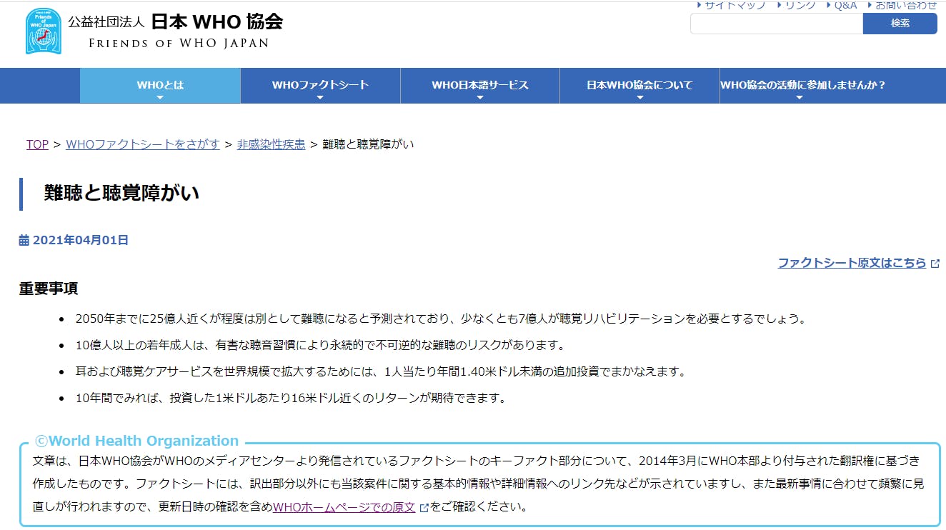 2021年にWHOが発表した「難聴と聴覚障がい」によると、2050年までに25億人近くが程度は別として難聴になると予測されており、少なくとも7億人が聴覚リハビリテーションを必要とするでしょう。10億人以上の若年成人は、有害な聴音習慣により永続的で不可逆的な難聴のリスクがある。(注:https://japan-who.or.jp/factsheets/factsheets_type/deafness-and-hearing-loss/)
