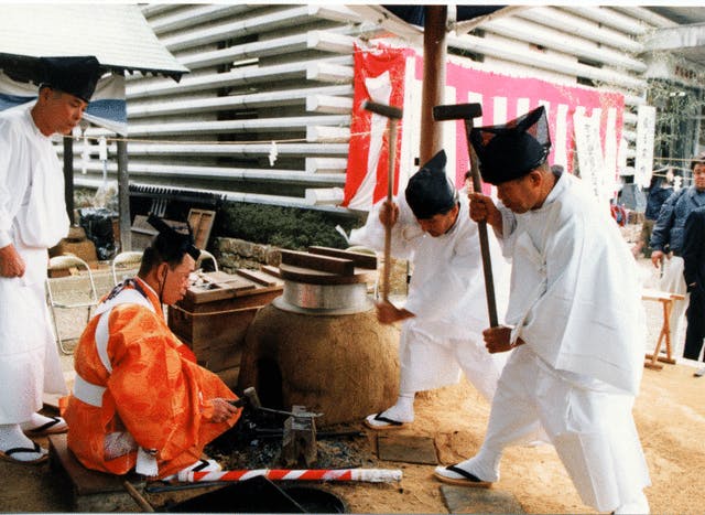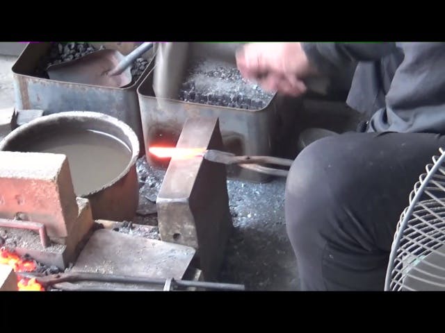 鍛錬(たんれん)は鉄を熱して大きな金鎚(かなづち)で叩いて薄く、強くする。