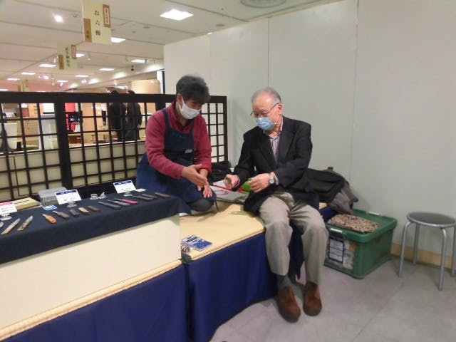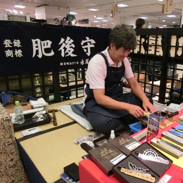 高島屋百貨店(東京・名古屋・京都・大阪、他各店)「日本の伝統展」に刃物部門の代表として参加されています。 各会場には毎年「肥後守ナイフ」の愛好者が多数来られますが皆さんは毎年新しものを 求められるそうです。 五代目はそのような愛好者の方に喜んでいただけるように日々の鍛錬と工夫に努力されてると言われています。