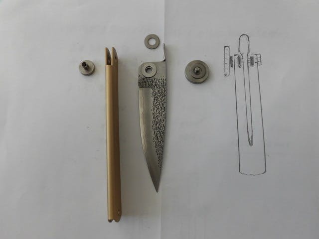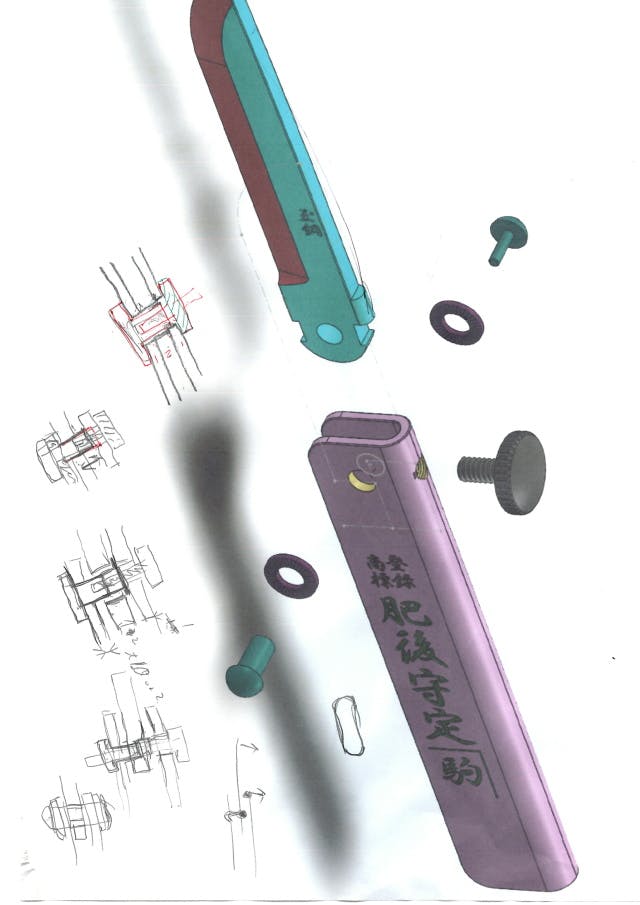 3年前、ケルンから帰った後フランス人の発想を肥後守に生かせないか試行錯誤を繰り返していた時に兵庫県の物つくりアドバイザーをされていた、神戸芸術工芸大学の芸術工学研究所所長(当時)の太田教授(現:名誉教授)に自分の発想を履行する為の相談をしたところ3D等々にてアドバイスを戴き、その後も継続的にご指導を仰ぎながら紆余屈折を重ねて今回の形・構造が誕生したそうです。