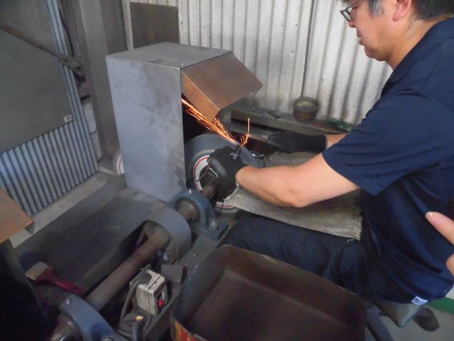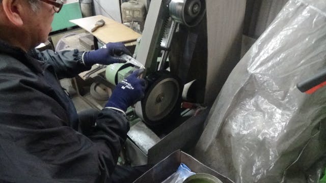 型抜き/鍛造(刃とチキリ)/焼き入れ/焼き戻し/歪取り/サヤ造り(刻印・曲げ・穴あけ・ガラ掛け・メッキ)/カシメ(ネジ式)/荒研磨/中研磨/刃先調整/試し切り/バフ磨き(試し切り)/研ぎ(刃調整)/仕上げ研ぎ/・・・包装。