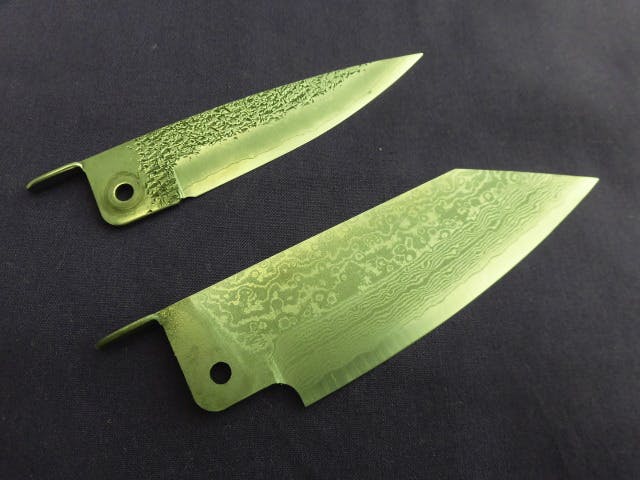 A:細身はV金鋼、幅広は多層鋼を持ちました、刃物鋼では最高級にて錆びにくい鋼材です。