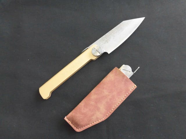 定番の真鍮材→ステンレス材で磨仕上げ→ステンレス材に真鍮メッキ仕上げにすることで、肥後守の製品であることを証明しています。