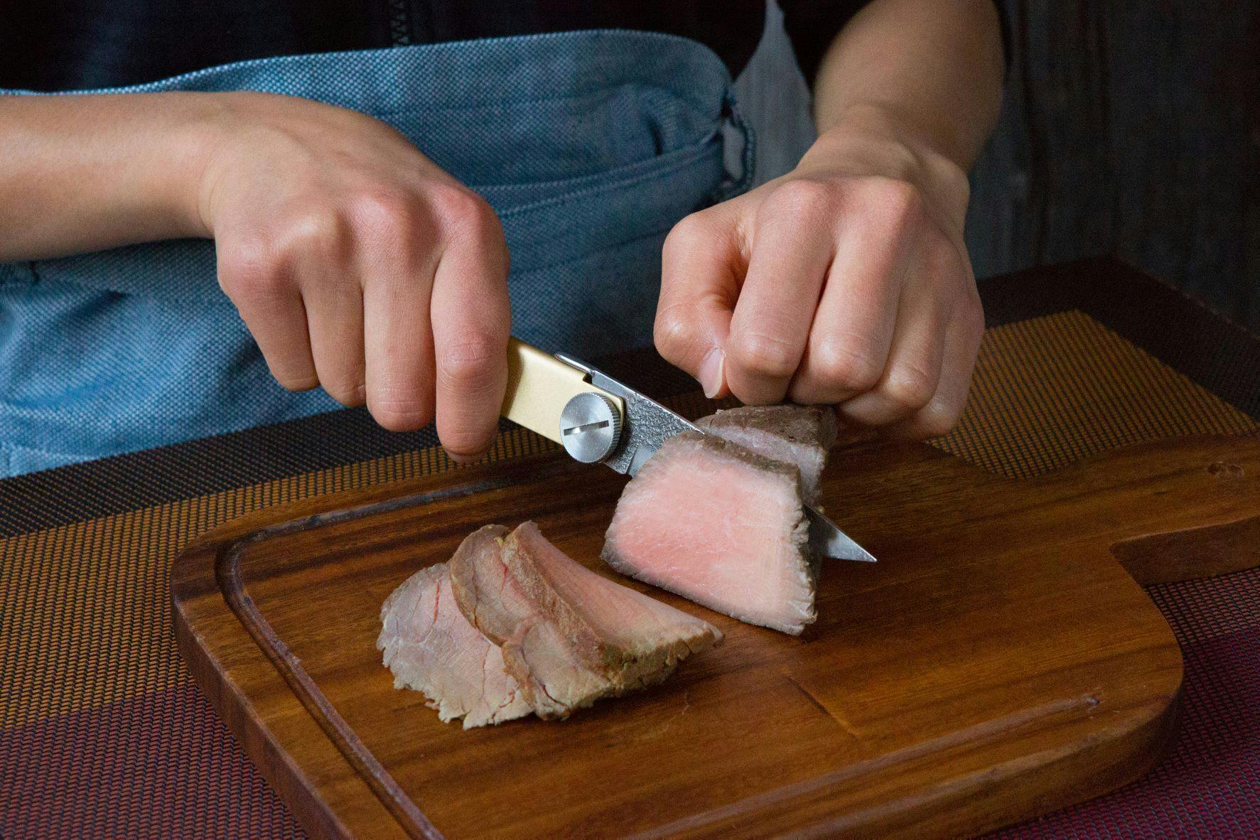 欧州では古来よりポケットナイフは木も食材も切るアウトドア的な使用が目的で造られている事を聞いたのが今回の折りたたみ包丁(ナイフ)の発想の起点となったとの事です。