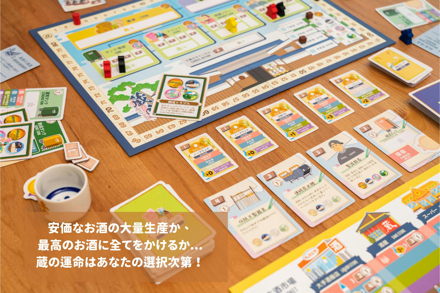 各プレイヤーが酒蔵の経営者である蔵元となり、経営手腕を競い合います。蔵人(従業員)に見立てたワーカー駒をはじめ、様々なカードやボードを使って遊ぶボードゲームです。