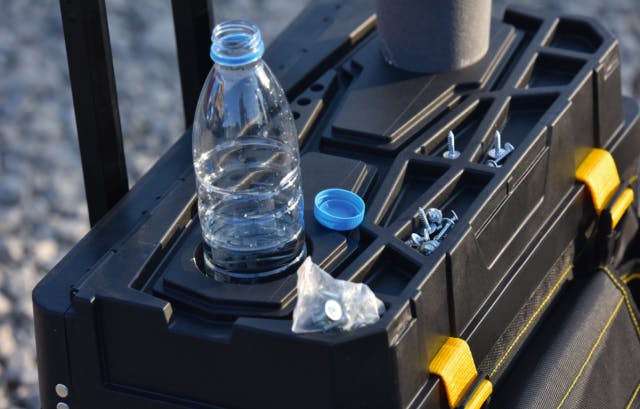 工具箱の蓋の部分にはドリンクと小さめの工具が配置できる設計で、散らかりやすい小物もスッキリ、無くさない!