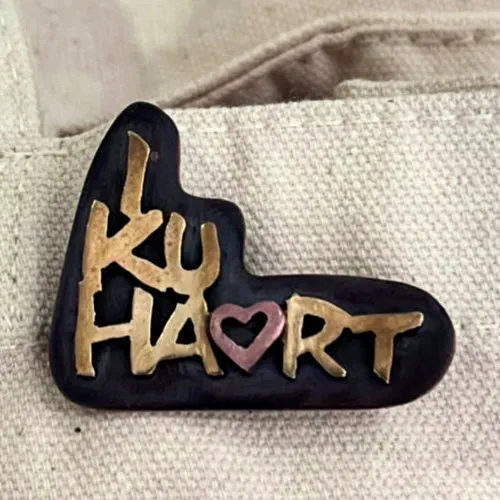 作者・川野昌通氏は、大阪芸術大学の工芸学科・金工専攻で学び、その後金沢美術工芸大学の彫刻専攻に進んだ作家です。鉄に象嵌(ぞうがん)された真鍮の"IKUHART"は、丹精込めて磨き上げられ、鉄とのコントラストで美しく浮き立っています。裏側のピンで留めたなら、あなたと一緒に移動する芸術品。実に手の込んだ、価値ある一品です。