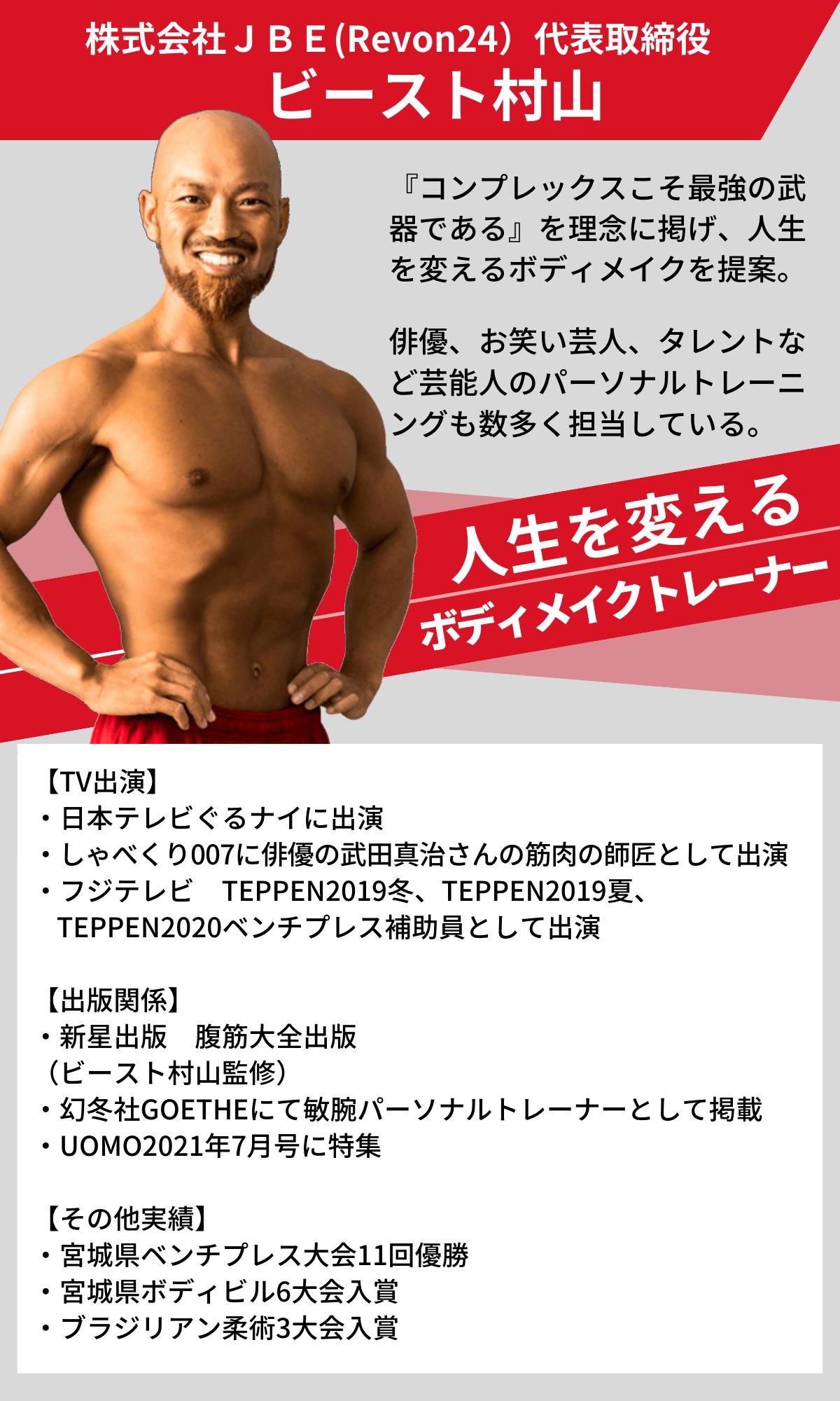 ページをご覧いただきありがとうございます!パーソナルトレーナーのビースト村山と申します。現在、渋谷区・外苑前のパーソナルトレーニングジムRevon 24を運営し、個人のお客様の体作りをサポートしています。