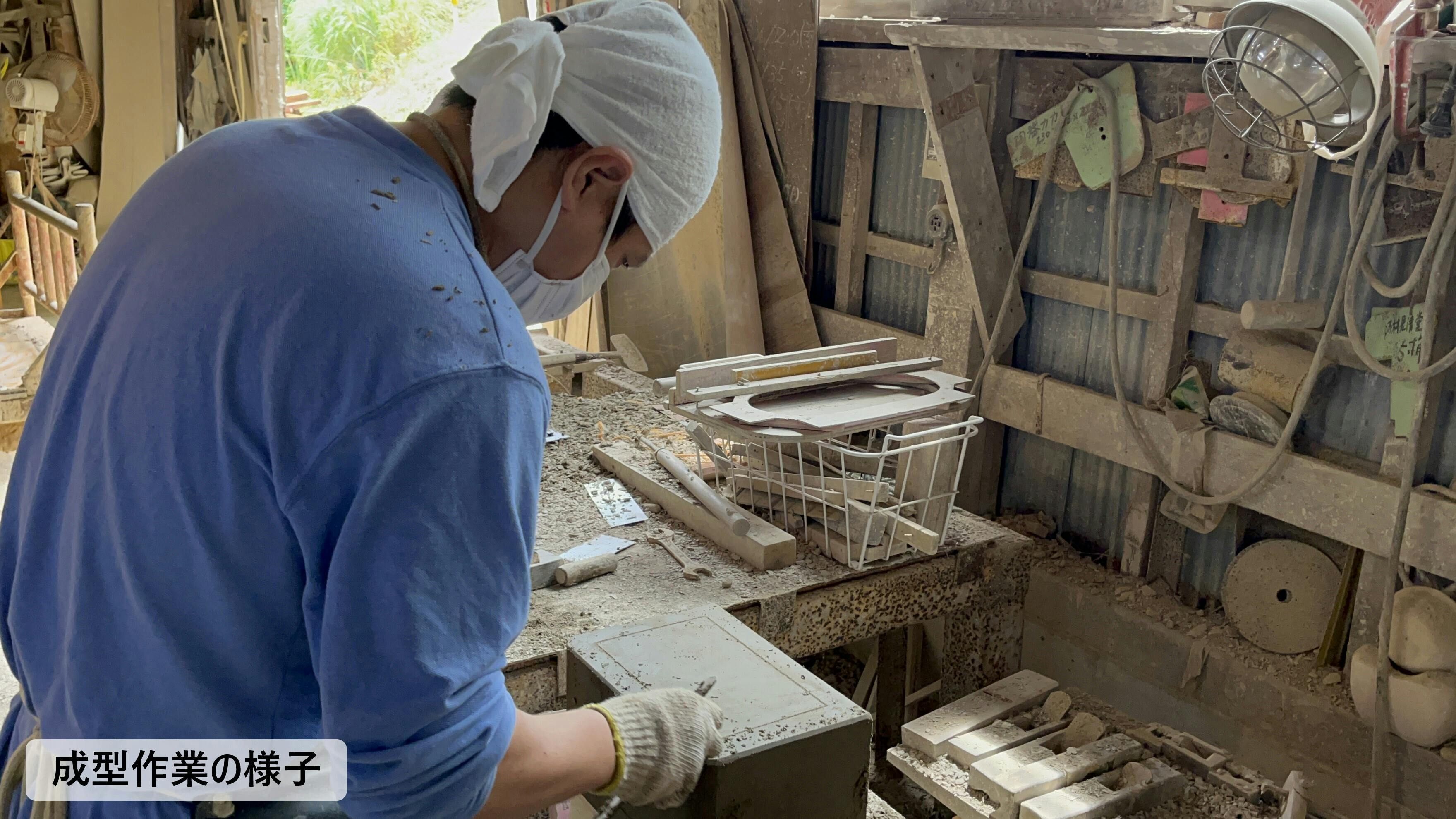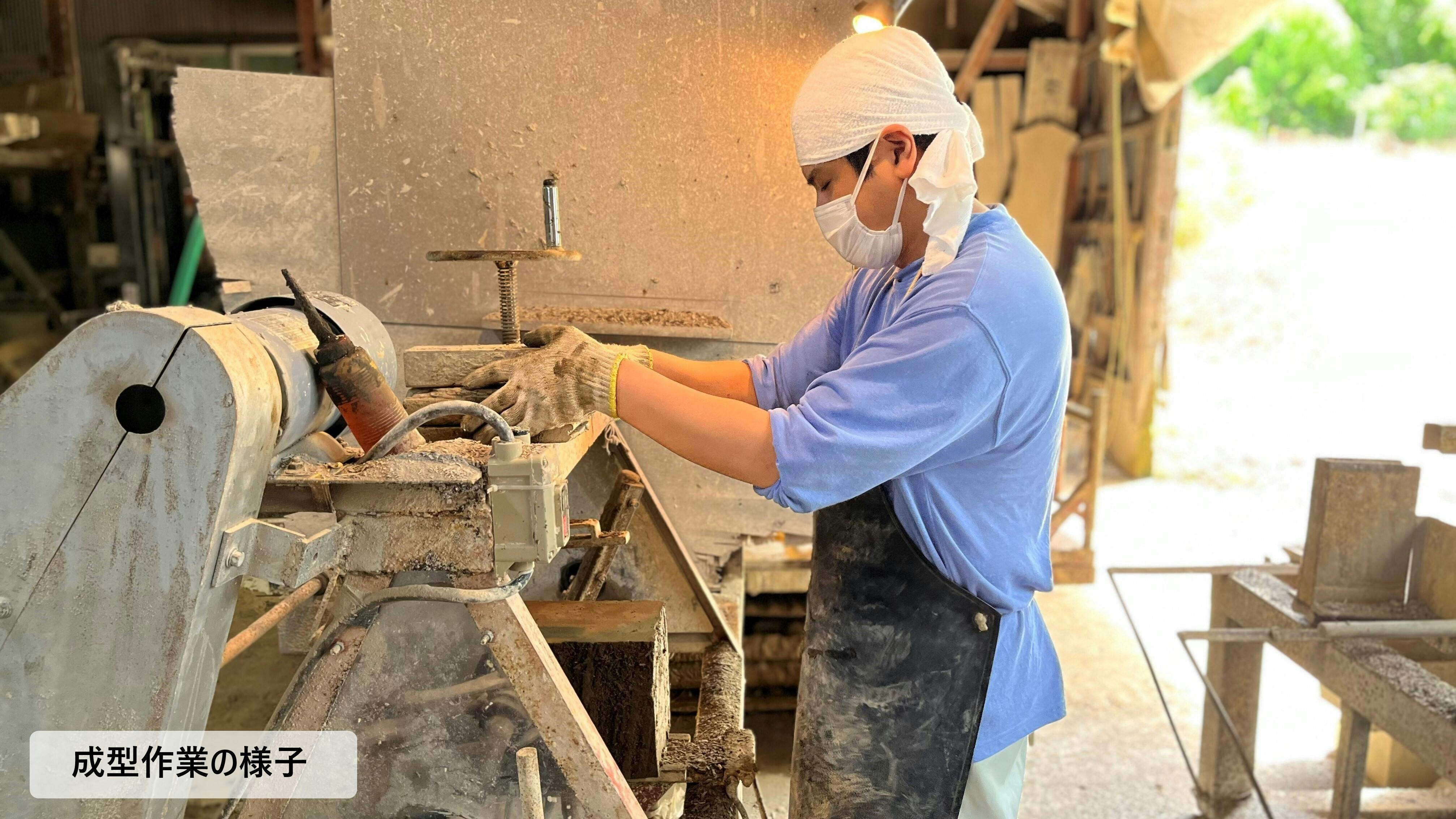 一方「切り出し」製法は、トンネルの奥深くから切り出した天然珪藻土をひとつずつ職人が削り、さらに約2日間薪窯で焼く製法です。天然の珪藻土を活かした製法のため、熱効率が非常に高く丈夫で、思いのほか軽いのが特徴です。時には筋や亀裂が入っているブロックもあり、土を知り尽くした職人でないと難しい作業です。