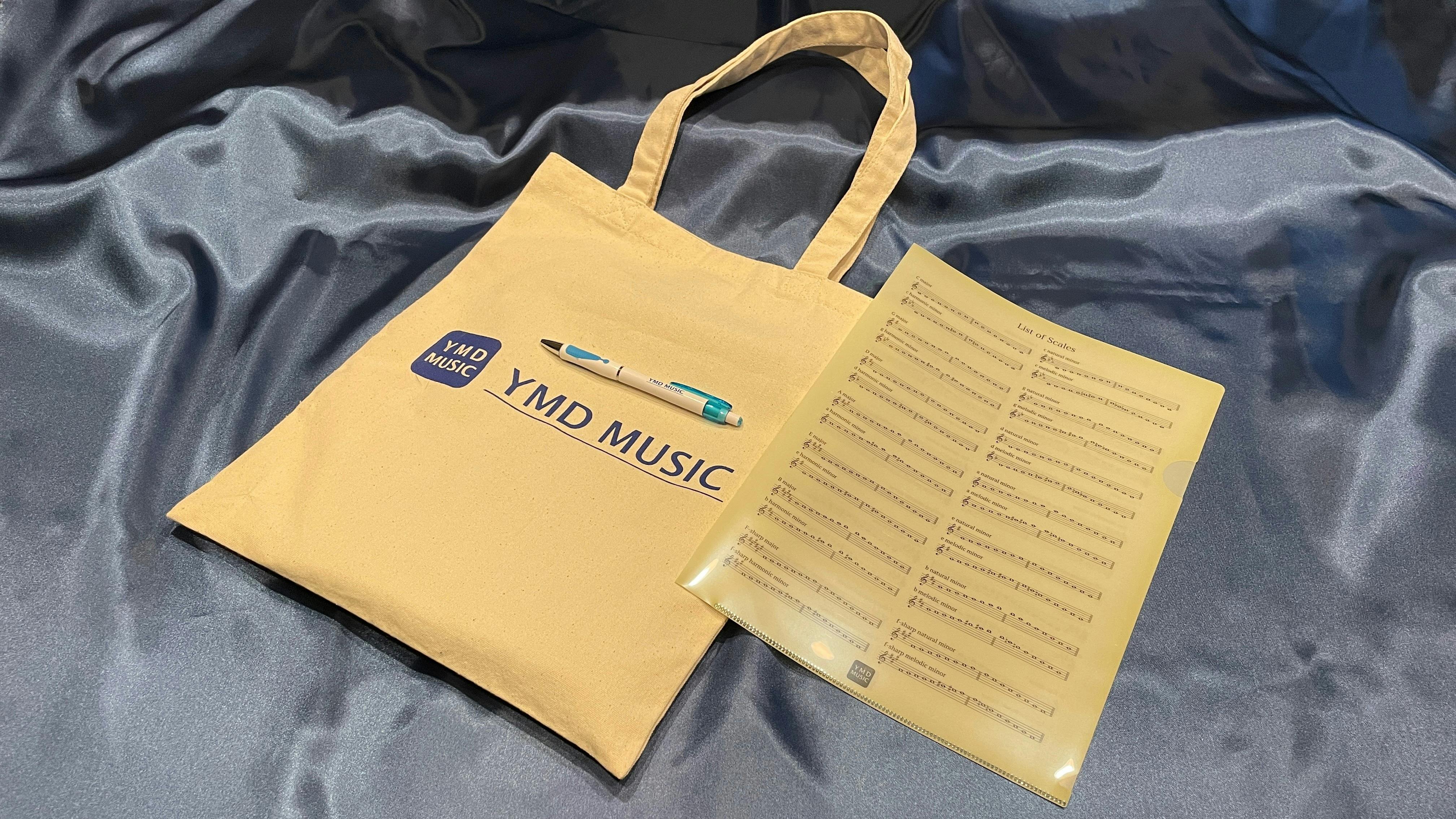 YMDミュージックオリジナルグッズのクリアファイル(販売価格:275円(税込))とトートバッグ(販売価格:1430円(税込))です。チケットとセットで通常よりお得に手に入れることができます。