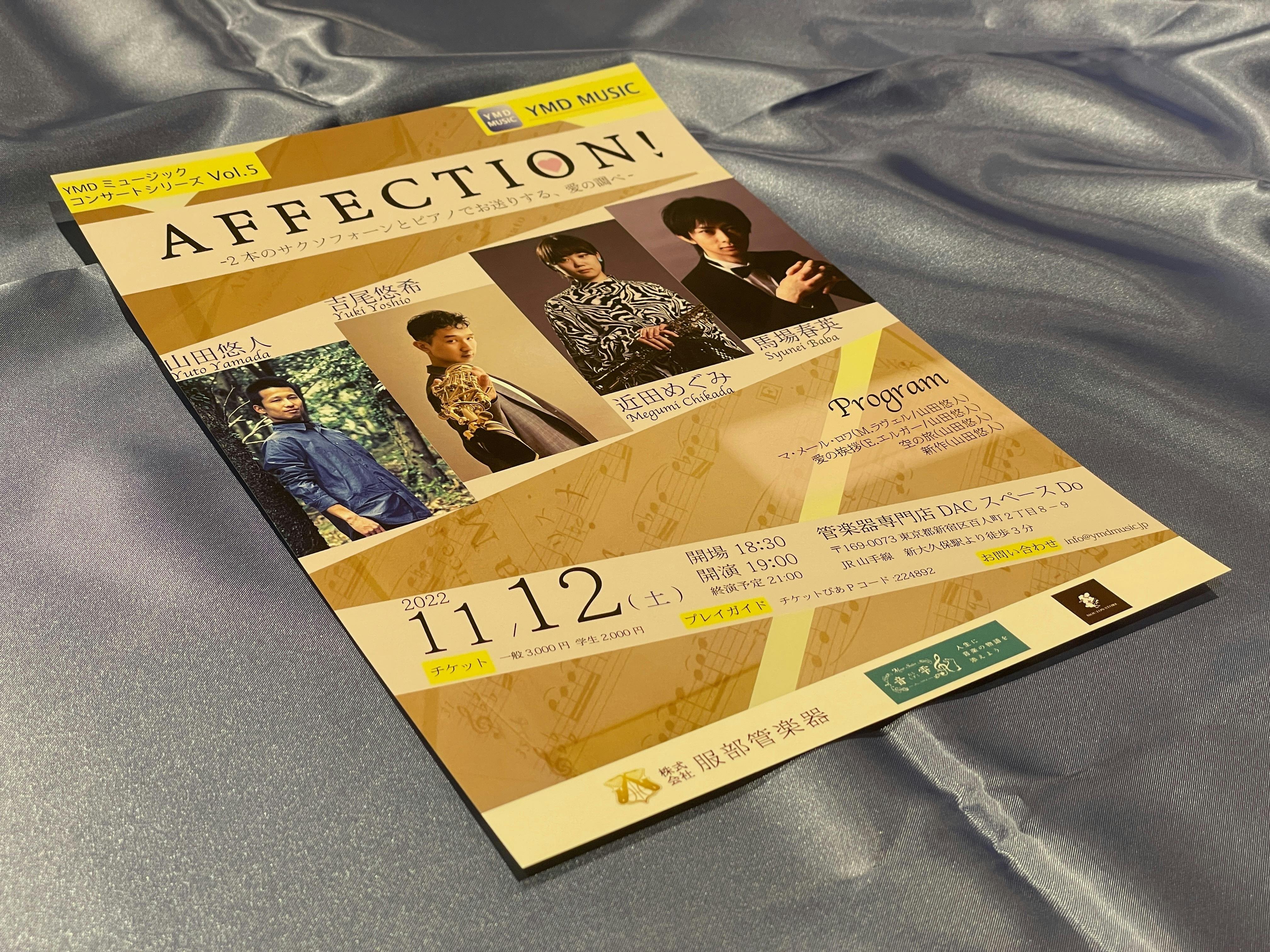 2022年11月12日開催「AFFECTION!2本のサクソフォーンとピアノでお送りする、愛の調べ」の公演パンフレット(プログラム)を本プロジェクトを支援してくださった皆様にお届け致します。YMDミュージックの公演パンフレットはA5サイズの冊子です。楽曲の詳細な解説、演奏会の聞きどころ、コラム等、内容が充実しており定評があります。