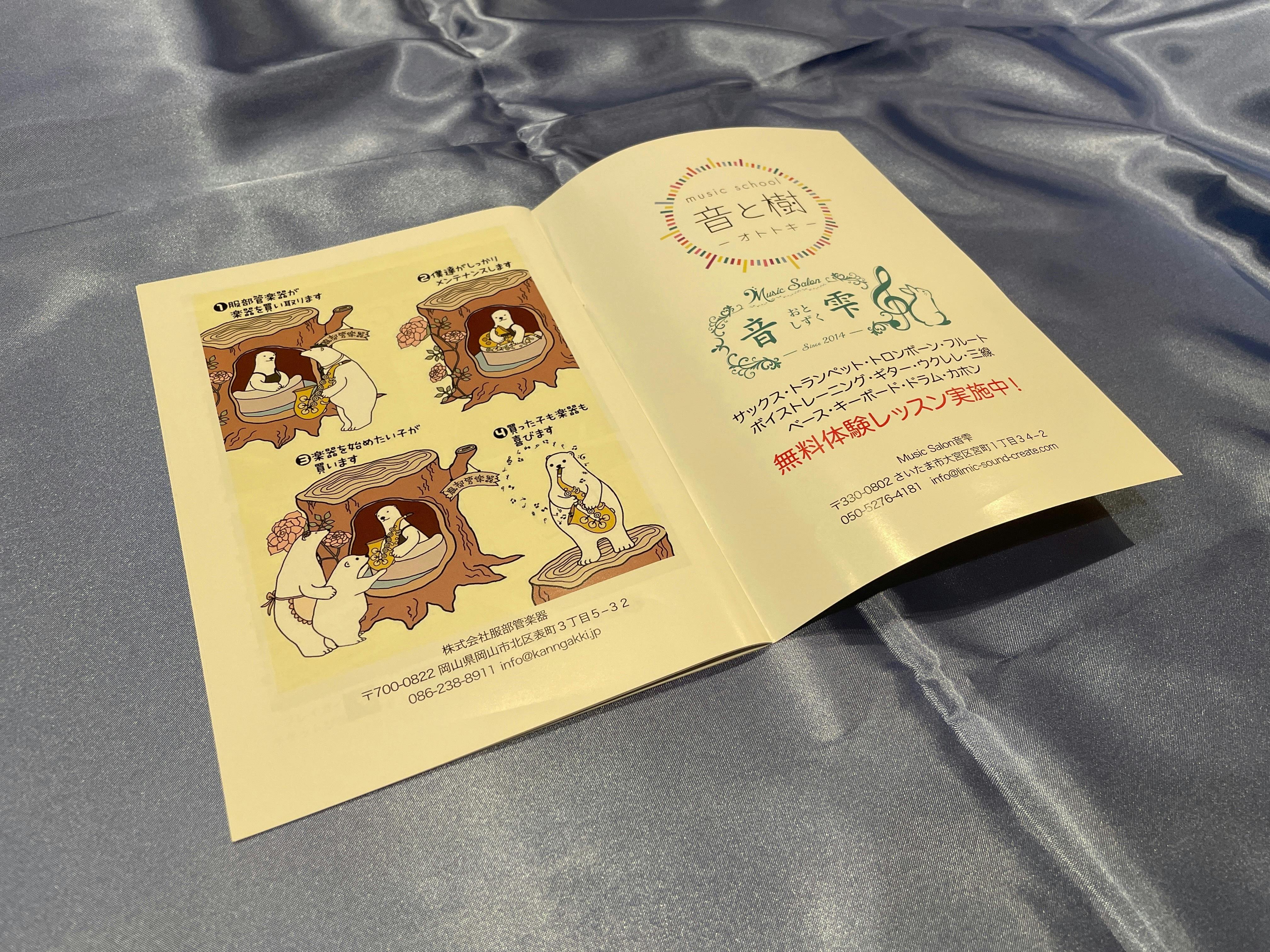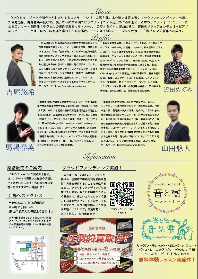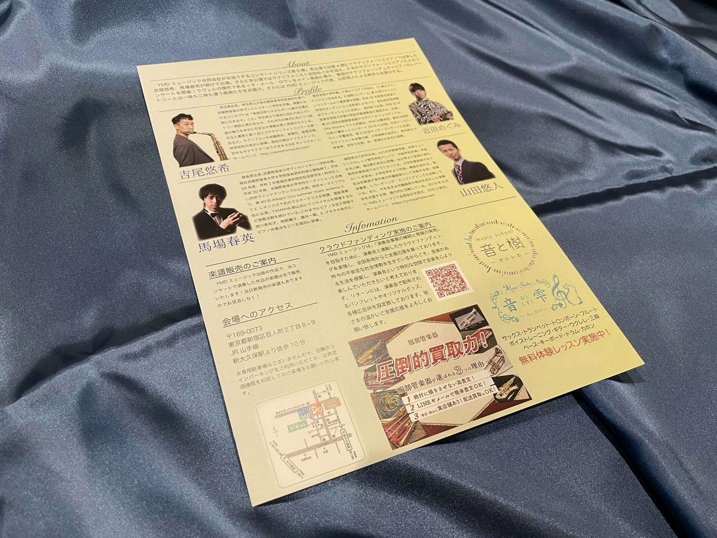 2022年11月12日開催「AFFECTION!2本のサクソフォーンとピアノでお送りする、愛の調べ」」の公演パンフレットにご希望のチラシを挟み込み、配布します。プロジェクト終了後、発送に関する詳細をご案内致します。11月上旬までに弊社まで郵送願います。チラシのサイズはA4サイズ1枚となります。音楽を愛好する方にダイレクトに届きます。演奏会チラシやCDチラシ等、既に印刷物がある方にオススメです。チラシは、最大200枚まで承ります。上記演奏会で余った分は、YMD MUSIC WEB SHOPの楽譜出荷時に挟み込みます。