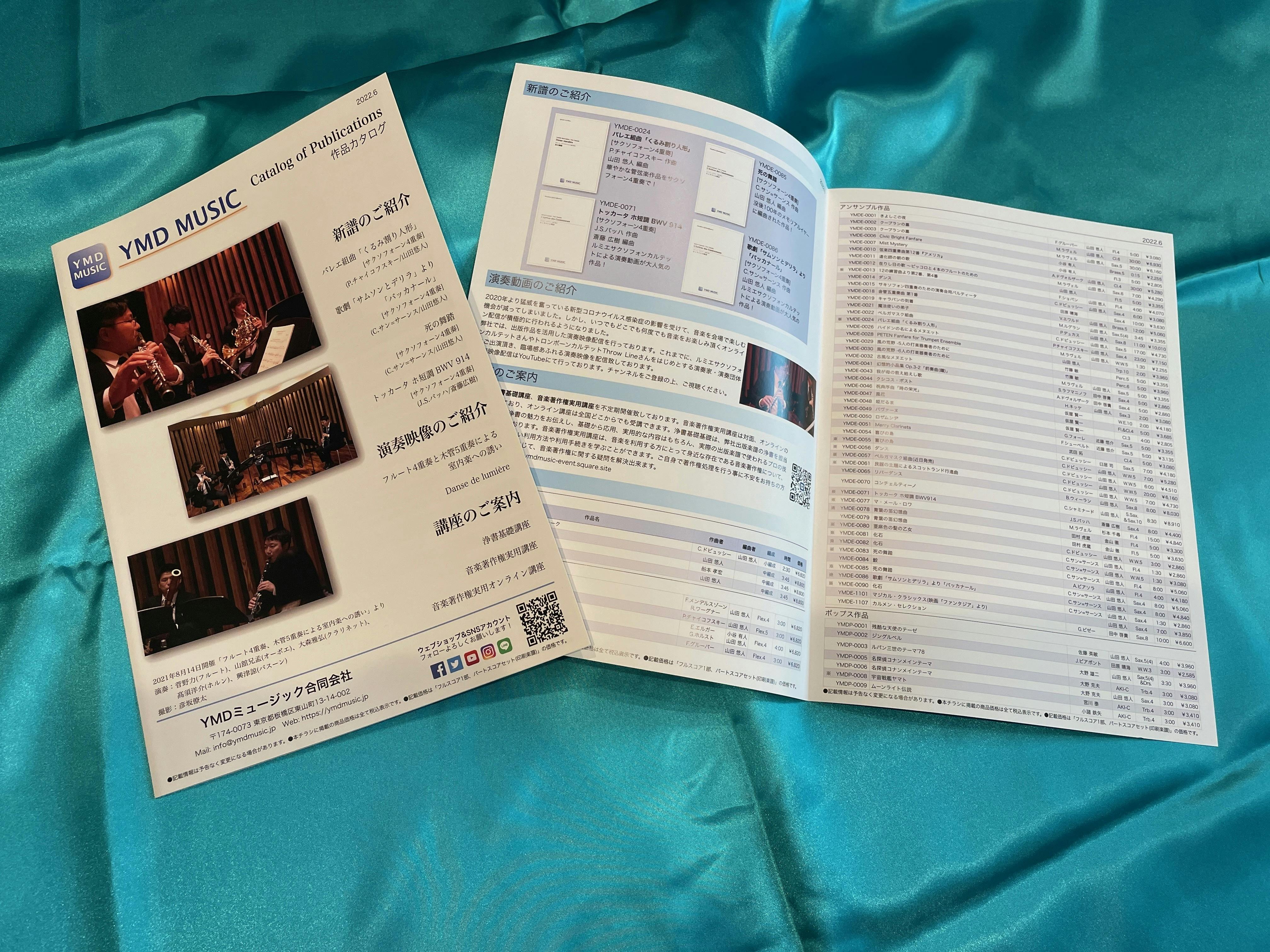 YMDミュージックが不定期で発行する出版作品カタログ(楽譜カタログ)の広告枠を提供致します。2022年12月に発行し、発行部数は3000部の予定です。サイズは1/8ページ(横長)、1/4ページ(横長)の2種類です。