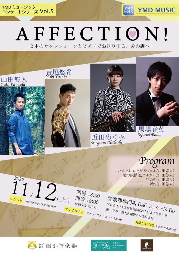 2022年11月12日開催「AFFECTION!2本のサクソフォーンとピアノでお送りする、愛の調べ」で演奏するYMDミュージック出版作品の楽譜セットです。通常よりお得に手に入れることができます。