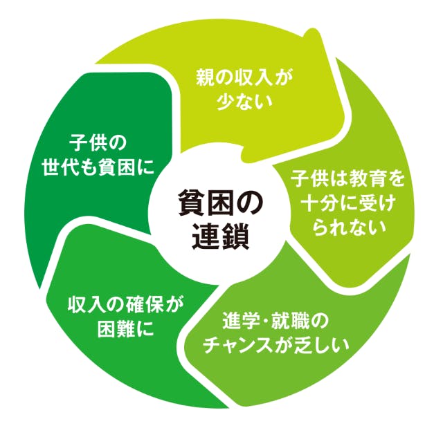 日本では教育にかかるお金が高いために、高校や大学に通わせることができない親の子どもは十分な教育を受けられずに進学や就職のチャンスが乏しくなり、その子どもの世代も進学することが難しくなる…というように、子どもの貧困が連鎖することも問題であると感じます。