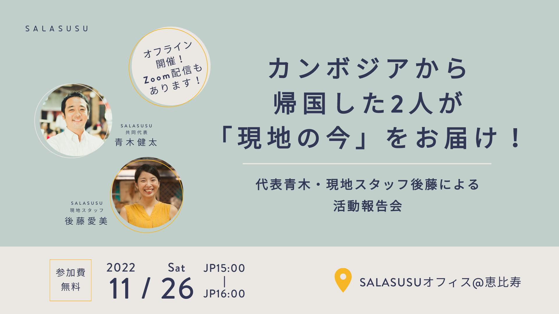 代表の青木、現地工房で作り手女性の教育を担当するスタッフ後藤が、今月日本に一時帰国しています!それに伴い、いつも私たちの活動を支えてくださっている皆さまに現地の様子をお伝えするイベントを企画いたしました。