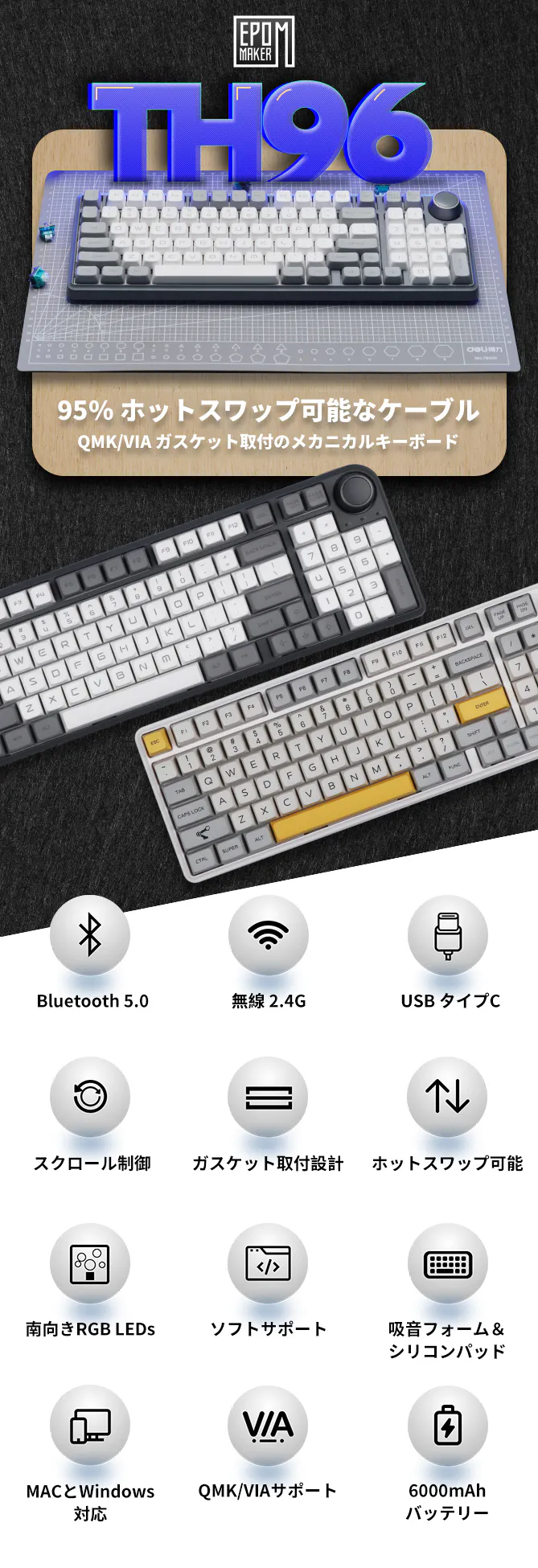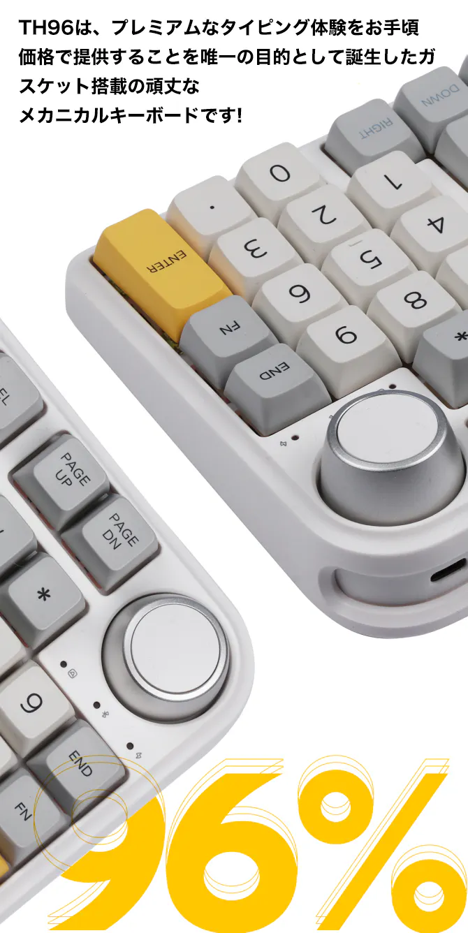 TH96はMacとWindowsの両方で動作する為、異なるデバイスをシームレスに切り替えて使うことができます。取り外し可能なUSB-C接続により、ケーブルや デバイスどちらでも接続したい時には有線で使える互換性を確保 しており、複雑さよりも利便性を重視したい方に最適です。カスタマイズ可能なQMK/VIAソフトウェアや 独自のシステムでキーボードを最大限に活用し、PCとMACキーボード用の2種類のキーキャップから選択できます。ぜひ、このキーボードを今日お求めください。