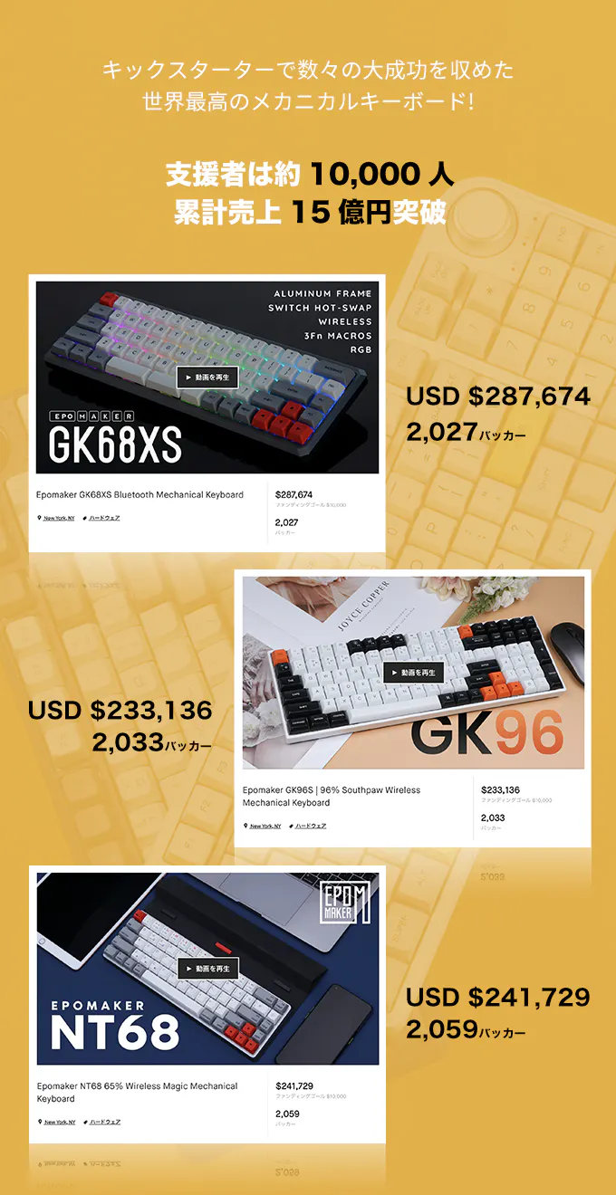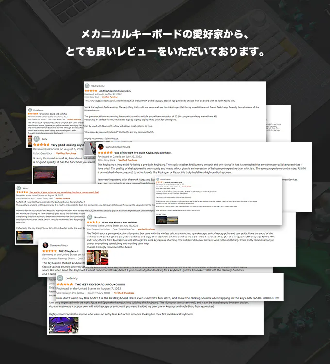若いゲーマー、ソフトウェアエンジニア、技術系ガジェットを愛する製品デザイナーで構成される私達のチームは、個性、機能性、手頃な価格を兼ね備えた素晴らしいの製品を開発することを目標としています。現在市販されているキーボードに満足できなかった私達は、究極の持ち運びやすさ、ワイヤレス、完全にカスタマイズ可能な機械式キーボードを作り、お客様の日常のニーズを全て満足できるようにしました。デザイン性に優れたキーボードをお手頃な価格でご提供することを約束します。