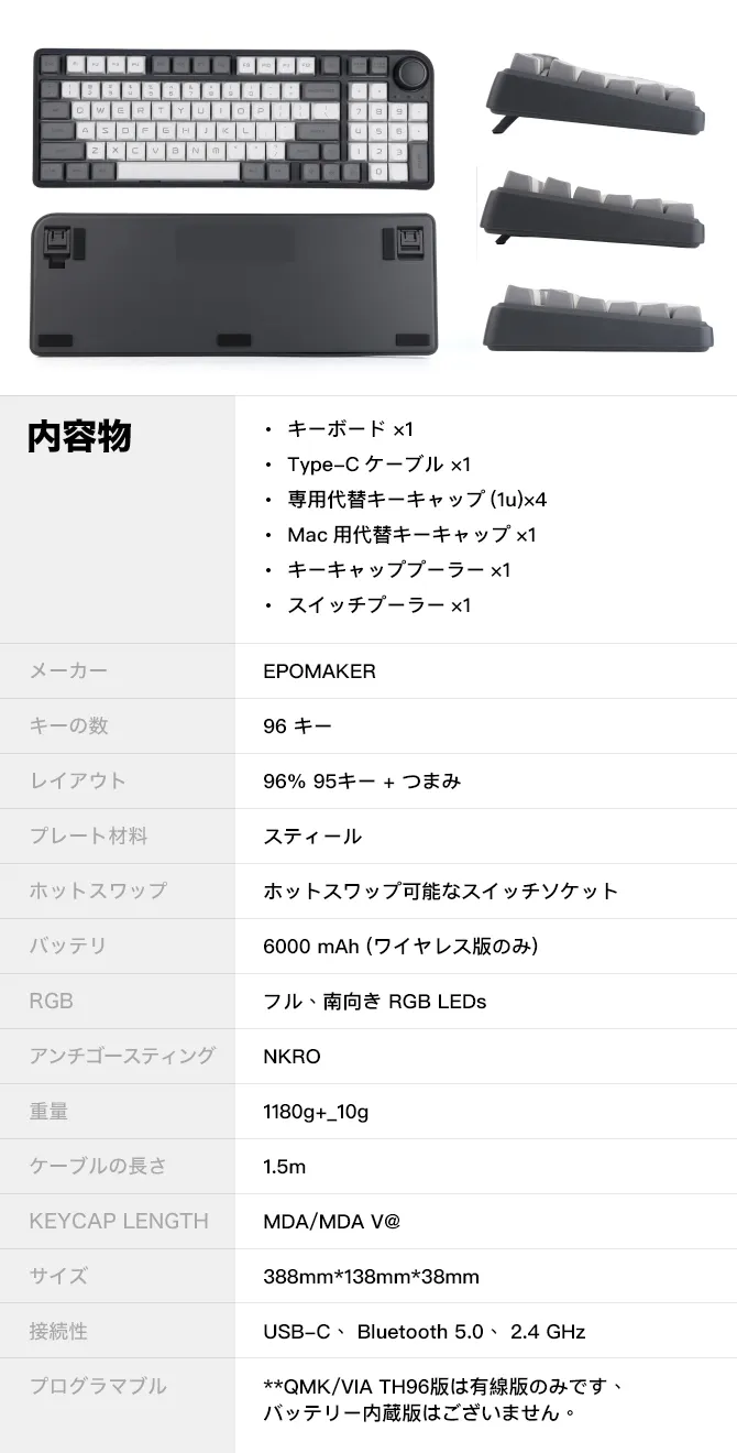 Epomaker TH96は、機能とプレミアムなデザインを詰め込んだパワフルなキーボードです。特別な構造設計のおかげで、TH96は、ボードに重量と強度を追加するステンレス鋼プレートを採用しているおかげでとても頑丈に感じられます。シリコン製のガスケット装着構造、シリコン製の吸音材、発泡ポロン、厚めのシリコン製底面パッド等、革新的な設計により、レスポンスの良い穏やかなタイピング音を実現しています。