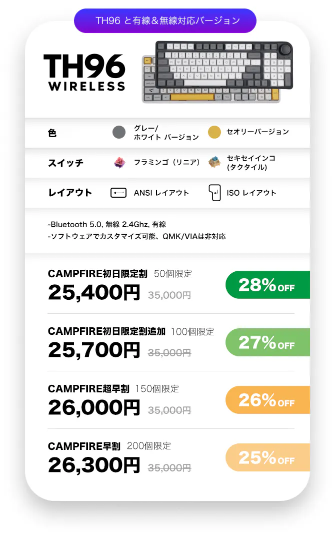 QMK/VIA版は有線モードのみです。QMK/VIAの使用を希望する場合は、QMK版のリワードを選択してください。有線&無線版 (3通りの接続)は専用ソフトでのみサポートされています。どのバージョンも、VIA/QMKや提供されているソフトのいずれかを使い再配置することができます。