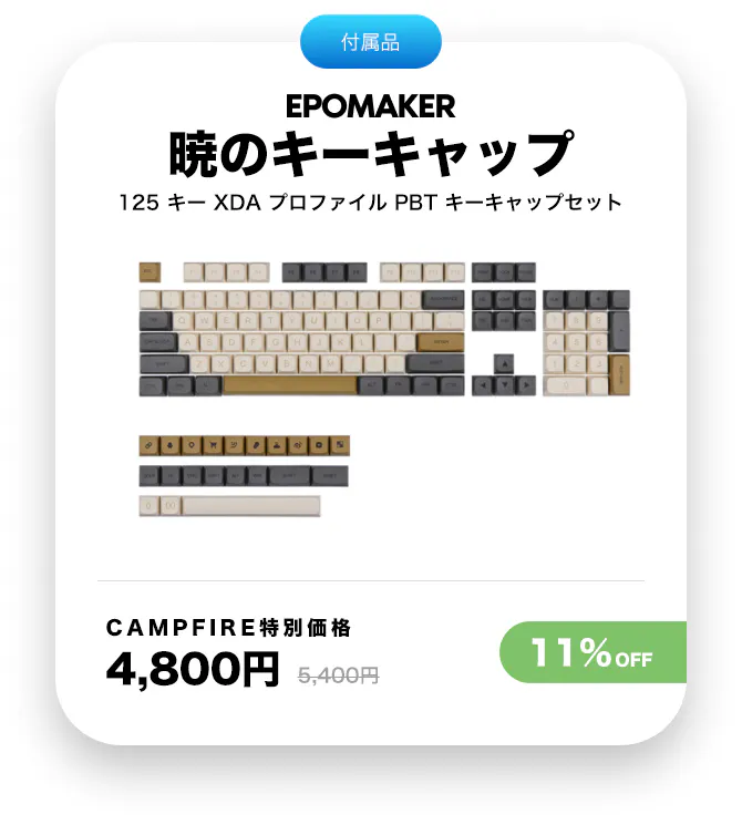 キャンペーンページのセオリ―キーキャップ版の画像では、テンキーに「END」と「Fn」の記号が表示されています。これは、写真のキーボードが試作品で、最終版ではないためです。実際には「+」と「-」の記号が使われます。この2つのキーの色は、画像のグレーではなく、テンキー上の他の数字キーと同じ色になります。この他にも、4種類のアイコンが付いたキーキャップが用意されています。