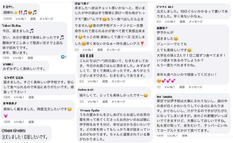 そんな、東さんの伊予柑ですが、2022年の最後引退シーズンにSNSで集まった口コミをまとめた画像がこちら。