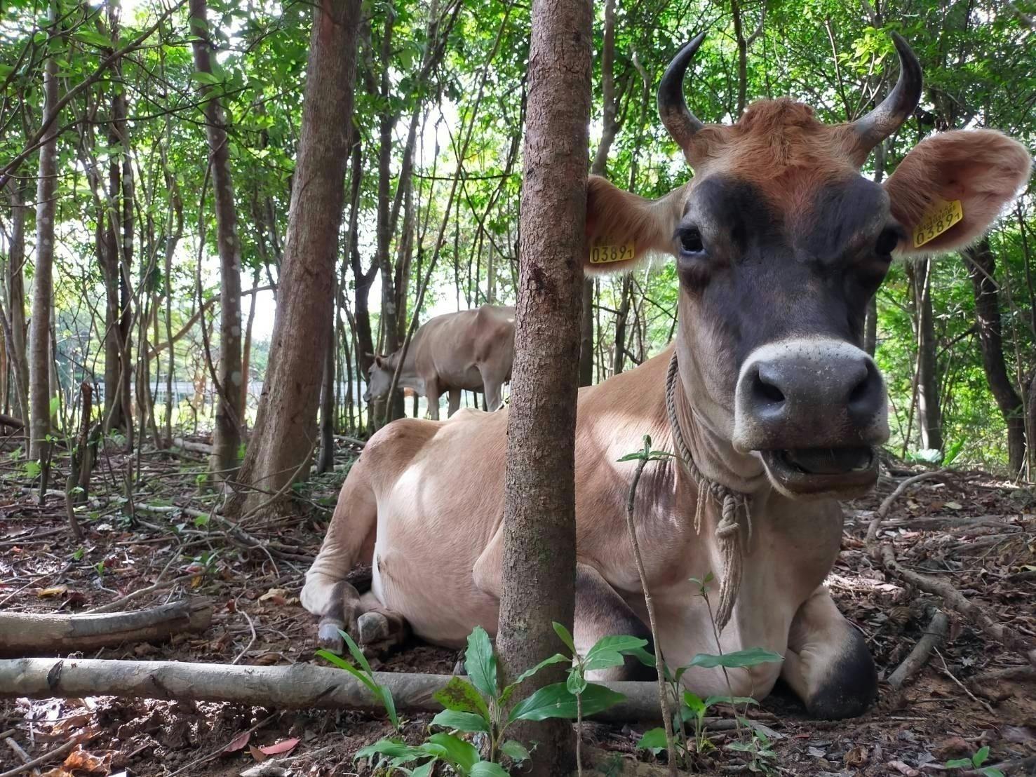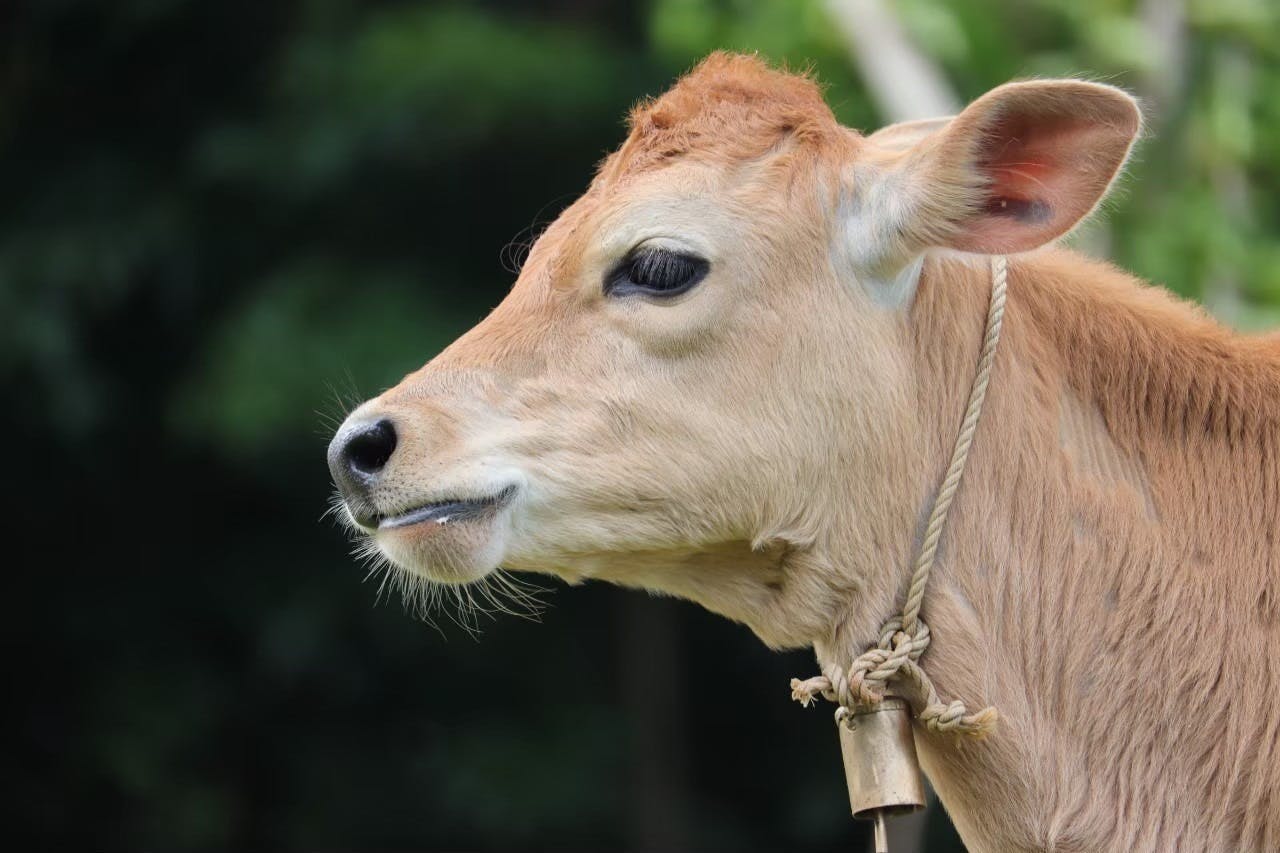 イギリスのジャージー島原産のジャージー種は日本で主に飼養されているホルスタイン種と比べ体格は2/3程と小さく、乳量も少ないです。その一方で乳脂肪率は平均5%以上と世界に数ある乳牛の中でも最も高く、世界一濃い牛乳とされています。また体格が小さいことは、斜面も多い山間地での放牧酪農には向いています。そしてジャージー種はホルスタイン種よりも5℃ほど暑さに強いともされ、南国沖縄県やんばるで飼育するには最適な品種なのです。元々は作物の栽培に適さないような寒冷地での食料源として飼養されてきた側面のある乳牛の歴史。亜熱帯で飼うということ自体が不自然ではないかという見方もあるでしょう。それでも、牛舎が無くても暑さを凌げる木陰を十分に確保したり、牛たちが好む風通しの良い休息地を残して整備するなど牛の様子を観察しながら工夫をすることで、次第にこの土地に順応した牛に代々改良されていきます。現に当牧場の牛たちは沖縄の真夏でも夏バテすることも無く、毎日もりもり草を食んで生活を送っています。
