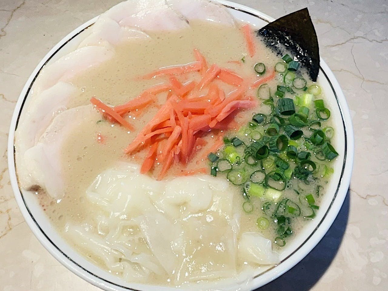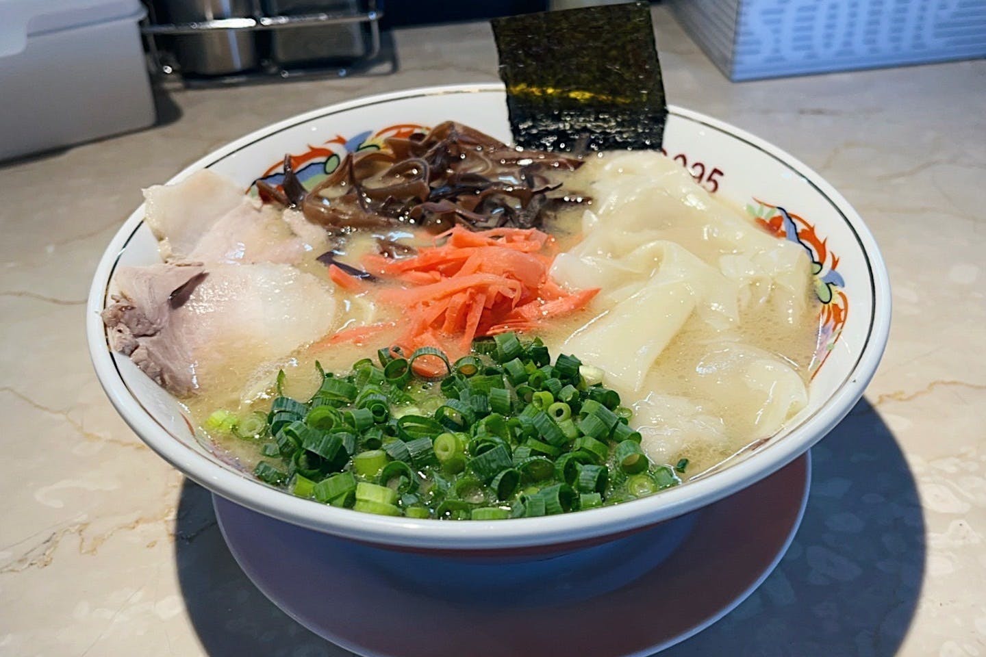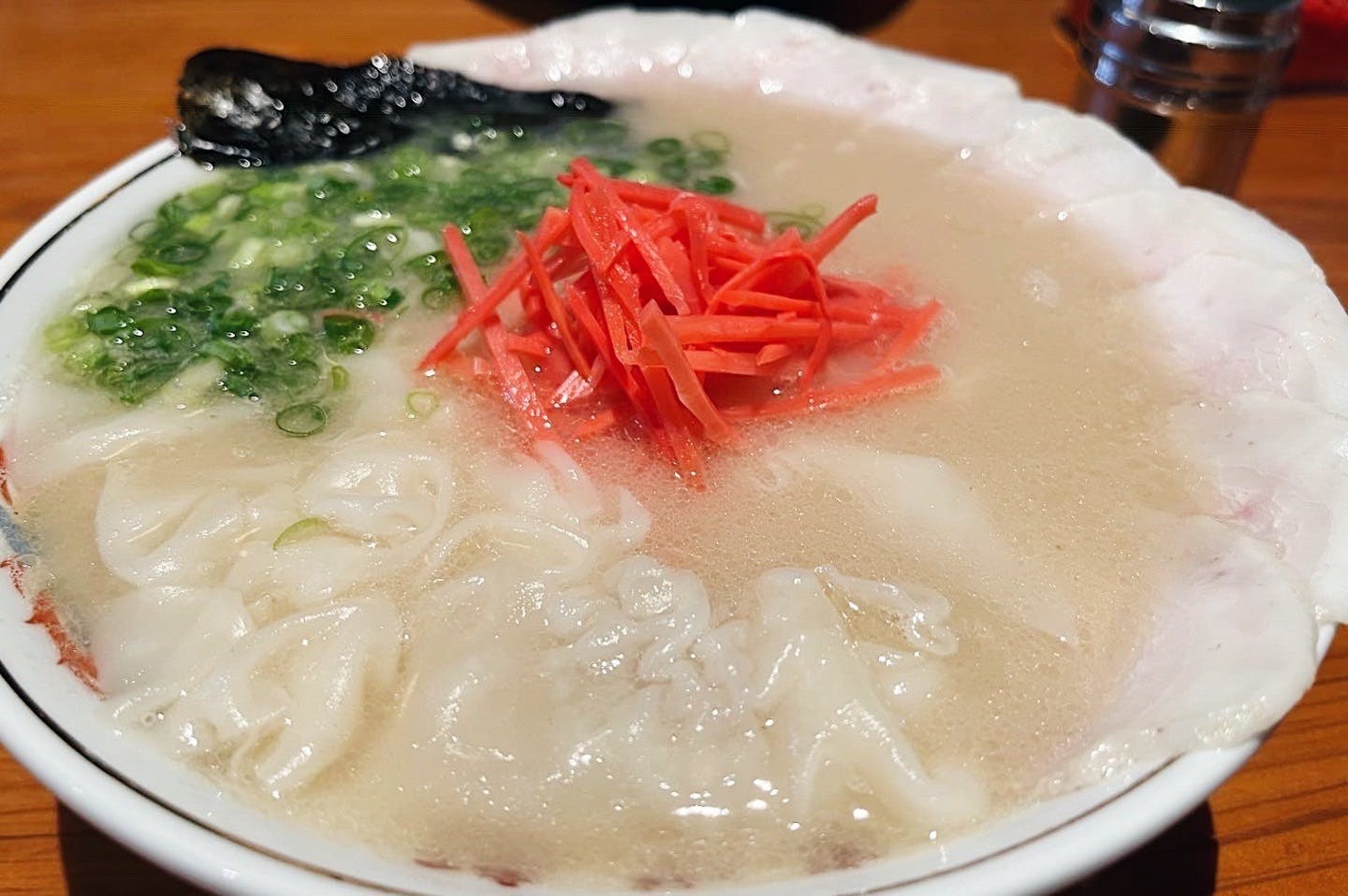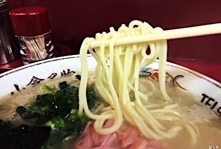 麺はモッチリとした弾力が特徴の中太ストレート麺。博多ラーメンは細麺が定番ですが、東洋軒のラーメンはスープとの馴染みがいい中太麵を採用しています。