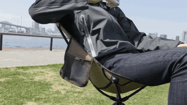アウトドアではのんびり過ごしたいから、背中をしっかりつつんでくれる余裕のあるサイズで朝から晩まで快適です。