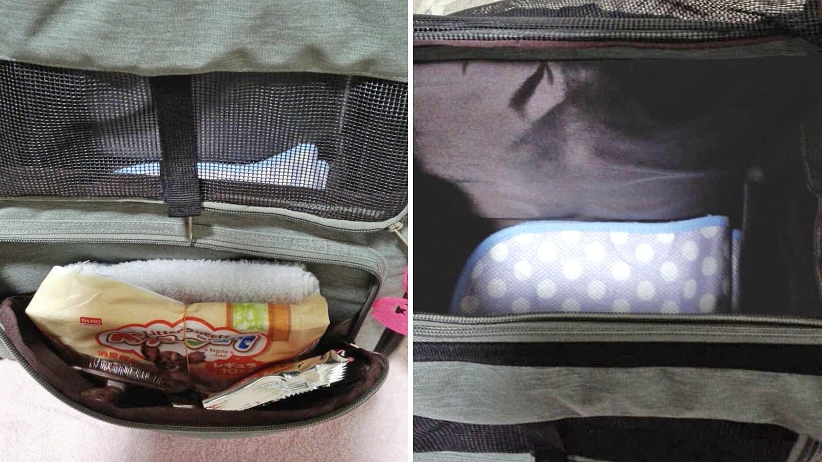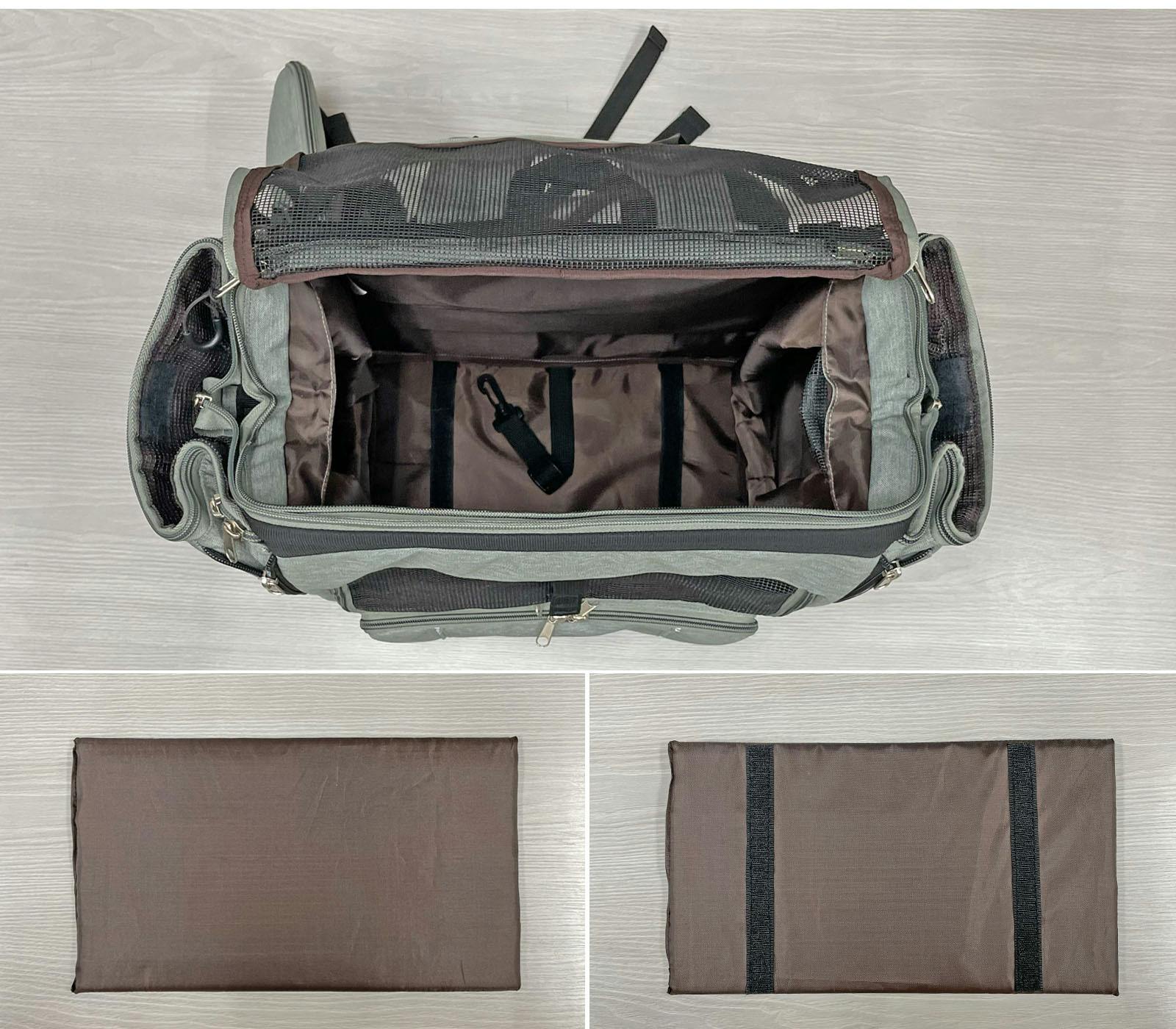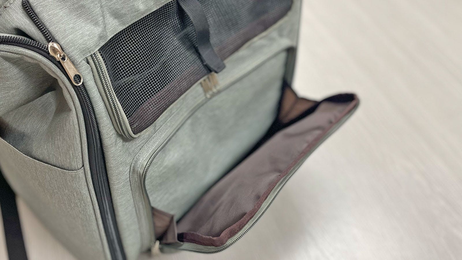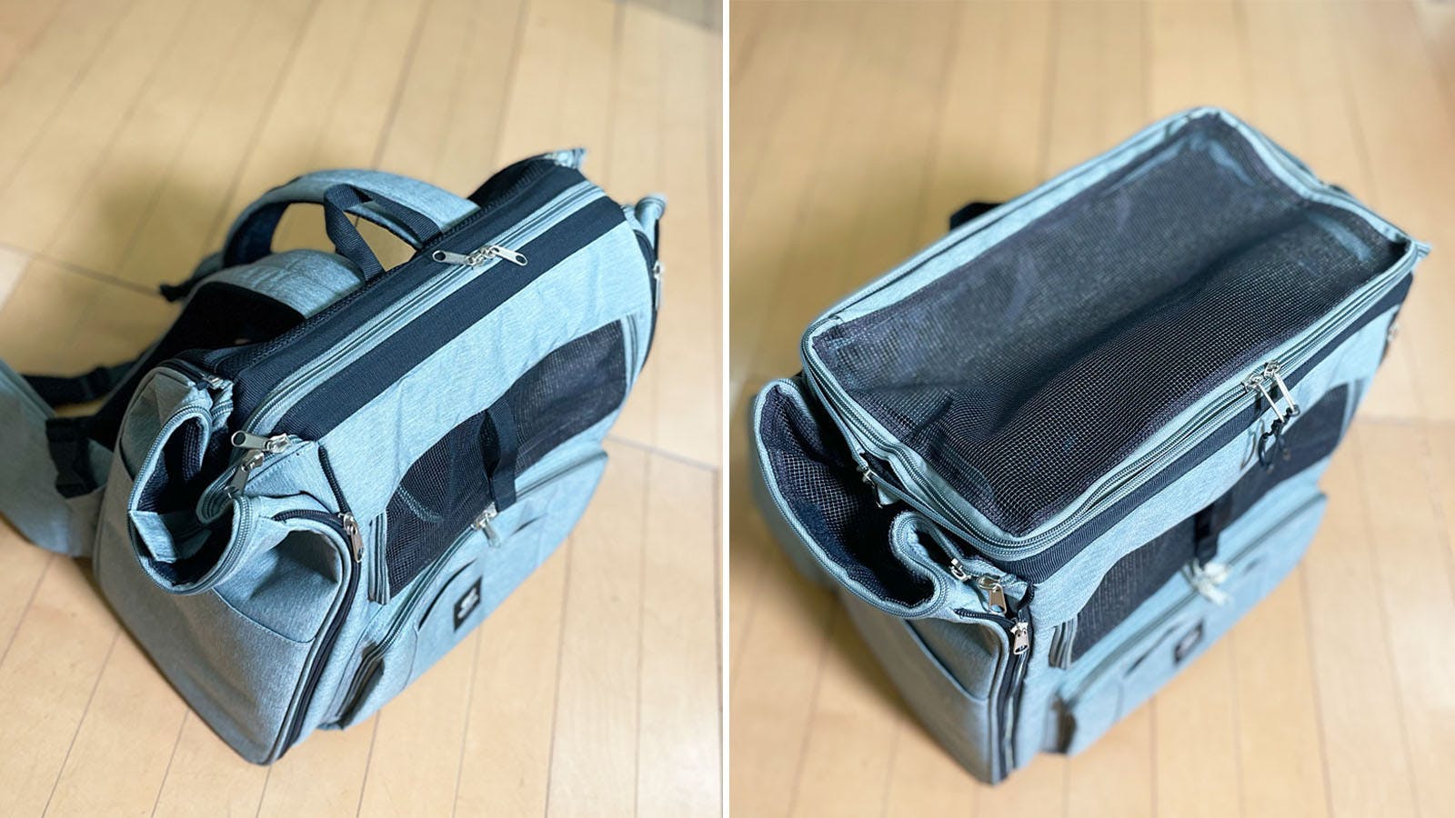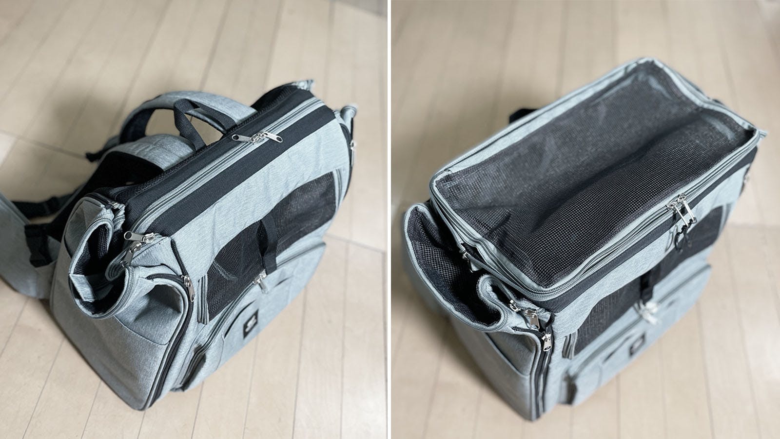 ケージの上部(左右と中央)はメッシュになっています。それぞれ独立してファスナーで開閉できます。※ケージとして使う際はリュックとして使用しないでください。
