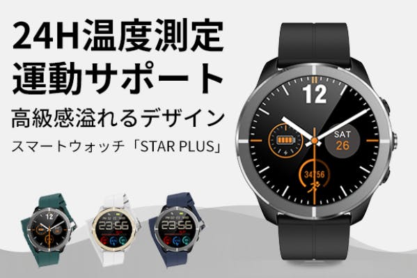 「STAR PLUS」はコロナ禍で誕生した新世代スマートウォッチです。24H温度測定ができ、様々な健康管理機能も搭載しています。アプリとの連携も簡単で、24種類のスポーツをモニタリングできます。