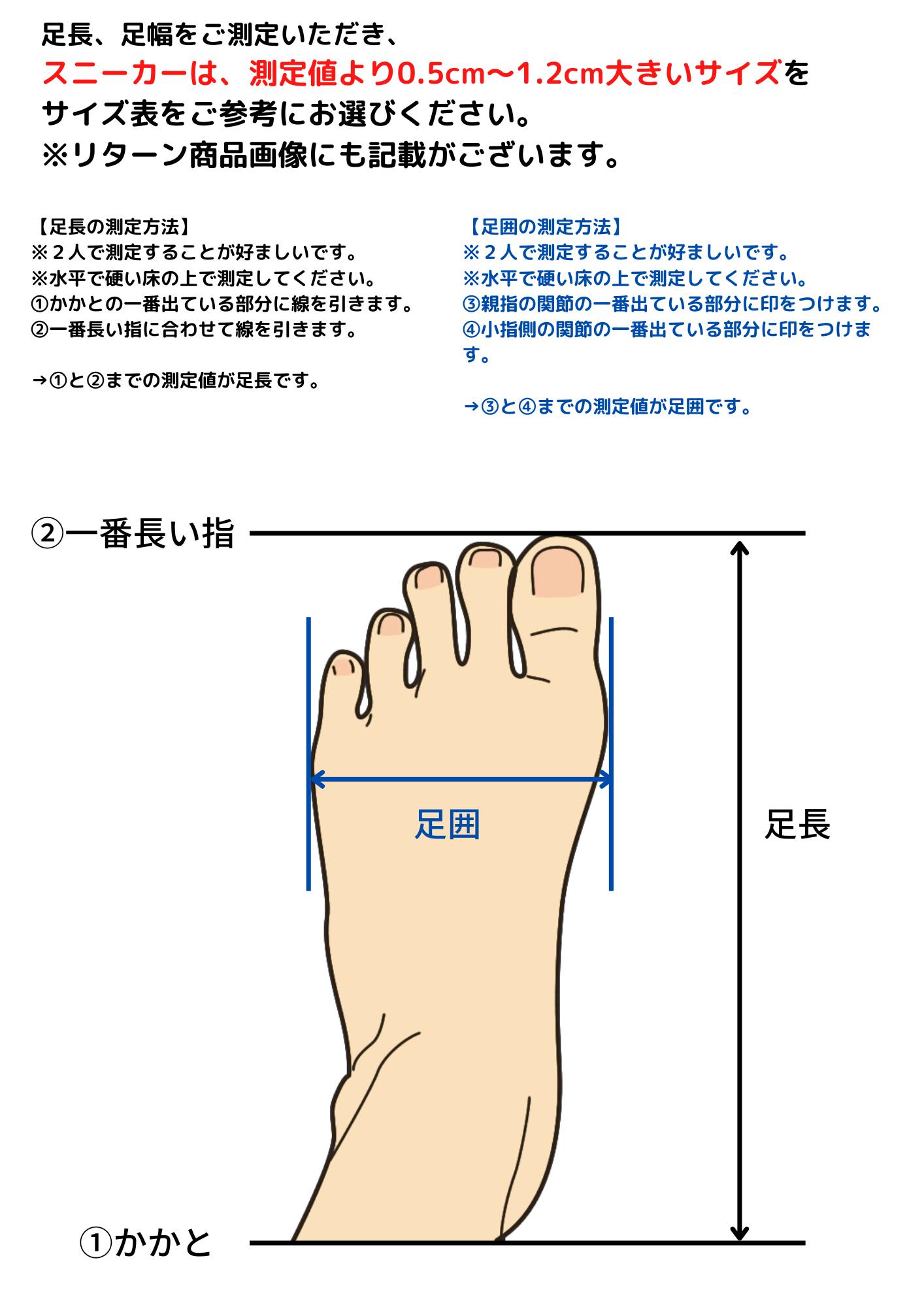 下記画像をご参考の上、足長や足囲を測定いただき、0.5cm~1.2cm大きいサイズをご注文ください。