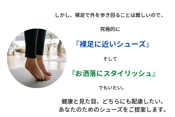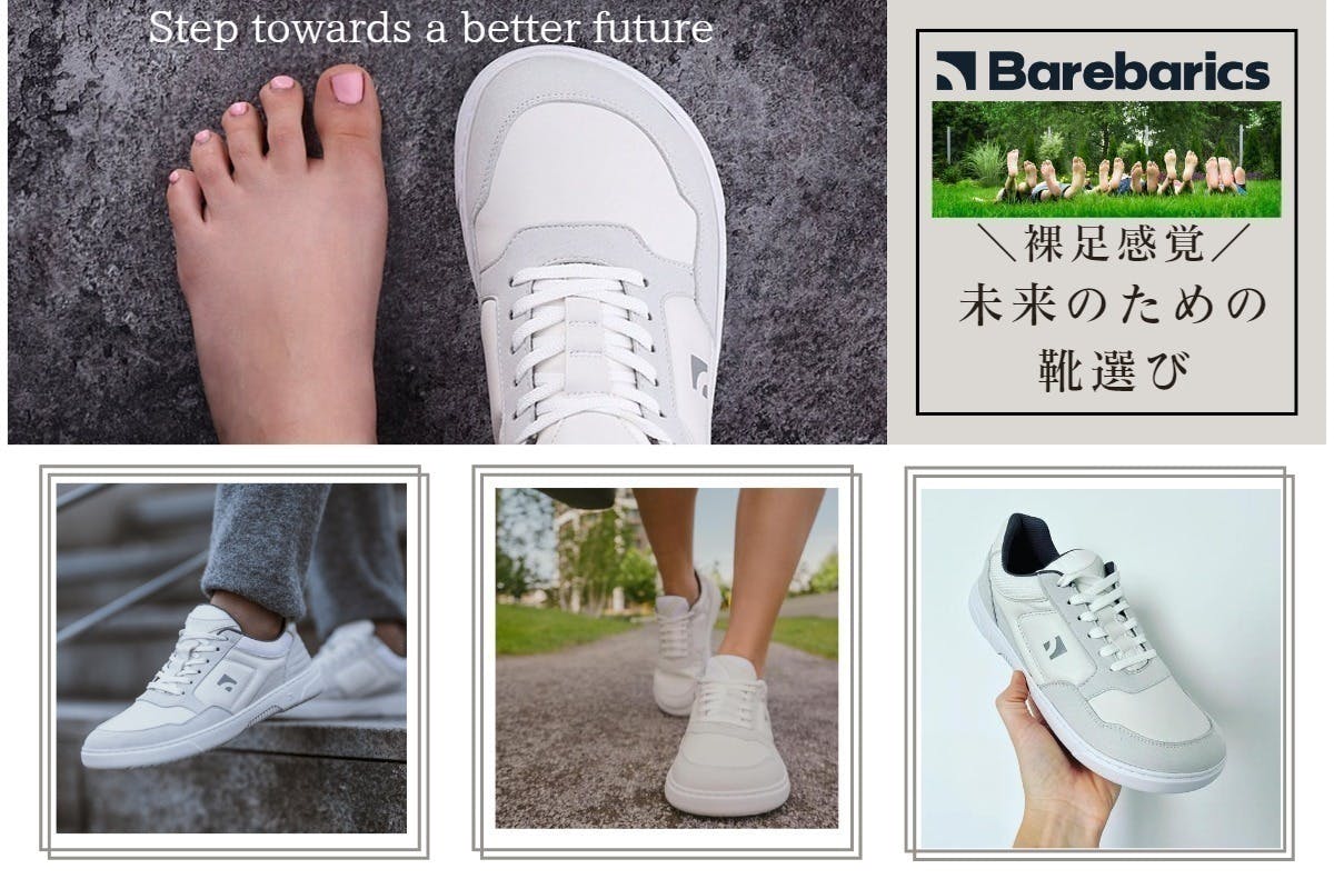 しかし、裸足で外出することは衛生上・安全上難しいので、靴本来の役割である、良い意味で『足を保護』できる『裸足感覚のベアフットシューズ』を履くことを、靴選びの新しいトレンドかつ普遍的なライフスタイルとしておすすめしたいと考えております。そのファーストチョイスが、【Barebarics】です。