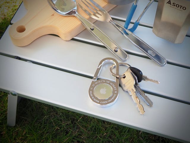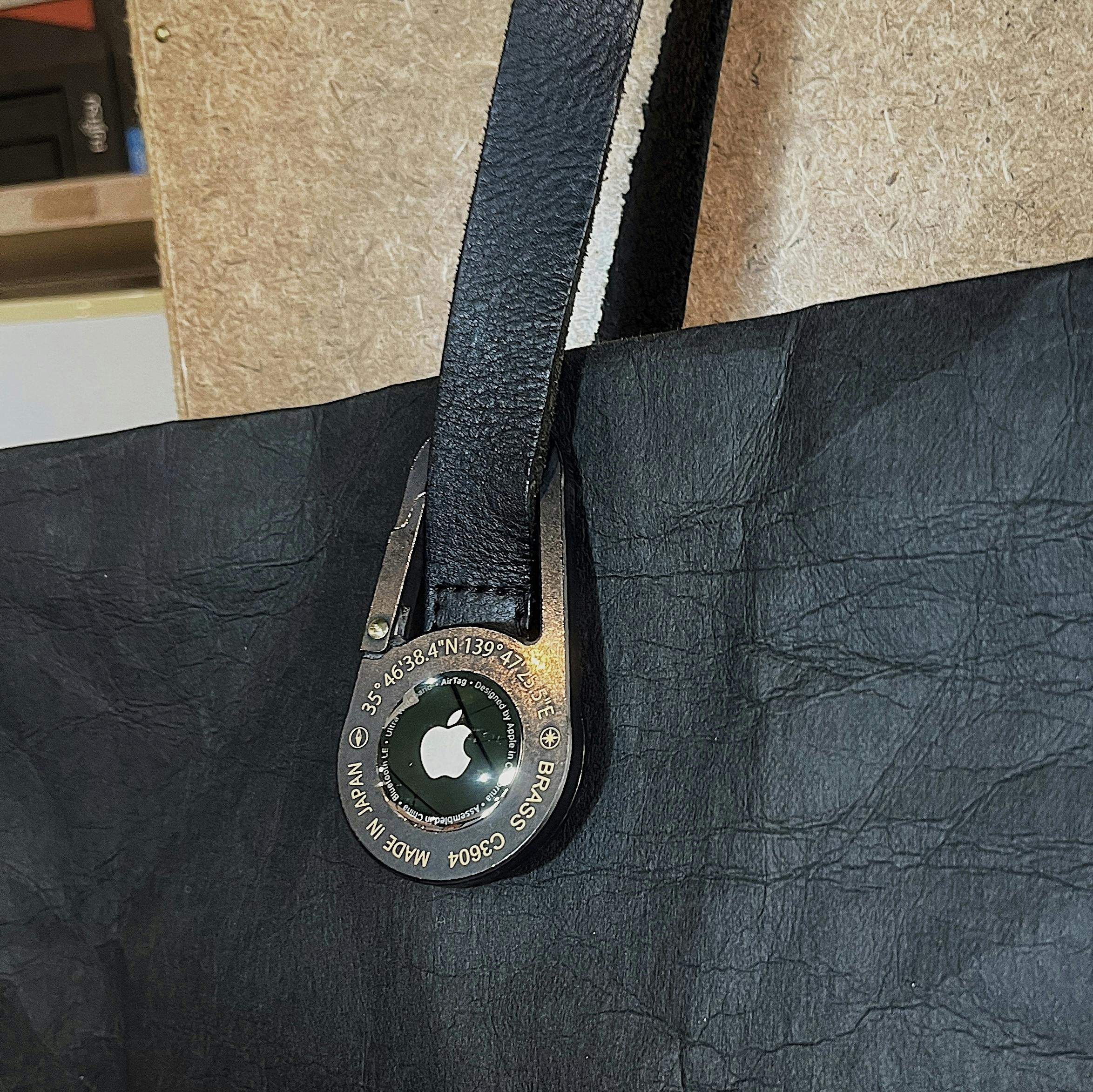 紛失防止機能が搭載されたAirTagをカラビナにセットしたら、あとは大切なものにつけるだけ。