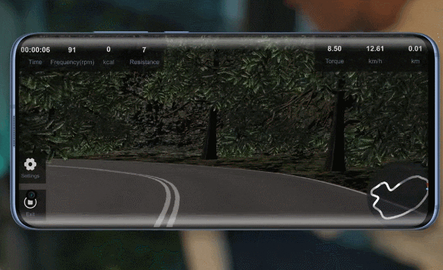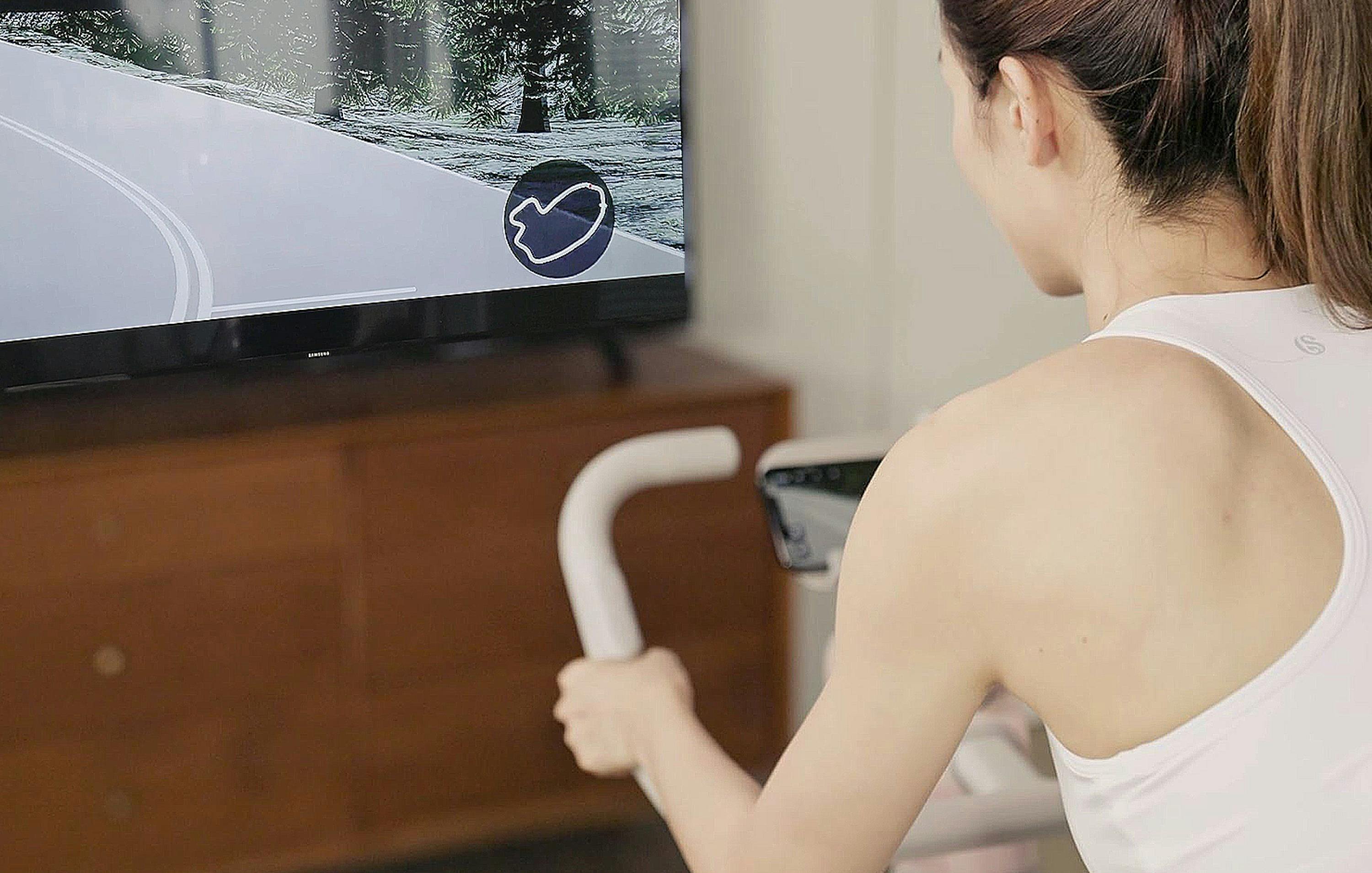 スマホ画面のみならず、Bluetooth対応テレビがあればご家庭のTVの大画面、タブレットなどで本物のサイクリングさながらのエクササイズが楽しめます。