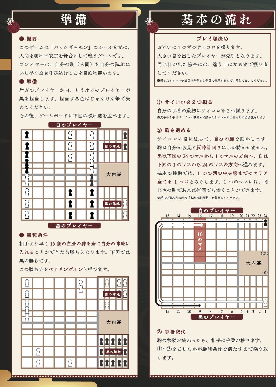 勝利条件は15枚の自分の駒をすべて自陣(黒はボード右下の1~5マス、白は右上の20~24マス)に進めること(平安京の構造上、通常のバックギャモンより自陣が1マスせまい)。