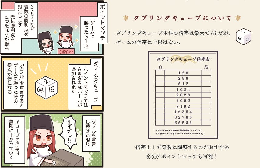ダブリングキューブという2~64の数字が書かれたキューブを使用して【ダブル】を宣言すれば、ゲームに勝った時のポイントが倍になります。